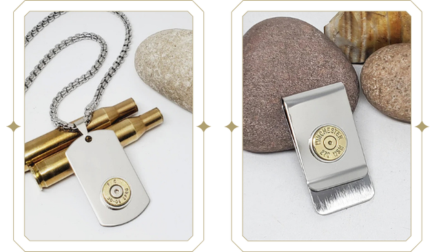 SureShot offers a large selection of men's accessories! Explore our collection featuring money clips, tie tacks, tie bars, key rings, push pins, cuff links, golf markers, belt buckles, bolo ties, zipper pulls and more. With our huge inventory of brass and shotgun casings, you can personalize the gifting experience to exactly the caliber or gauge he prefers!