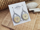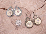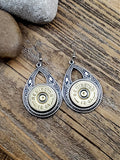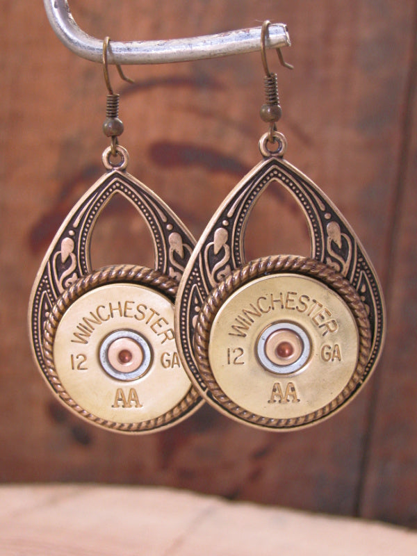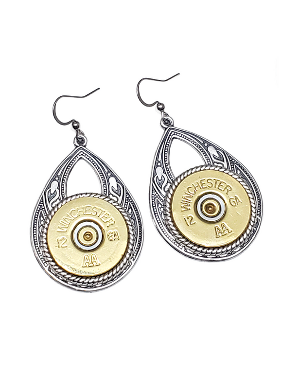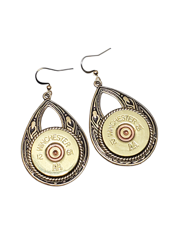 Detailed openwork teardrops set with 12 gauge shotgun casings mounted in our signature rope bezels. Hung from stainless French wires.