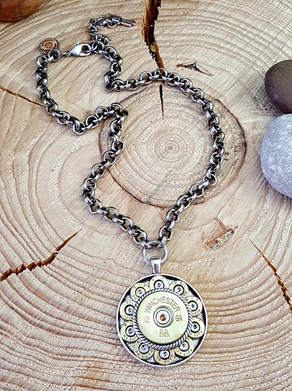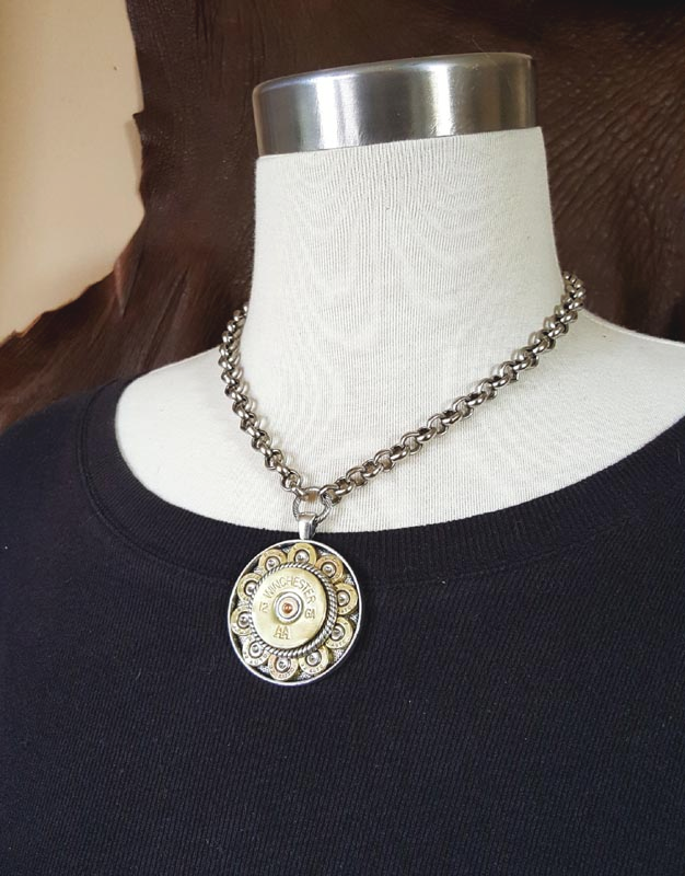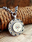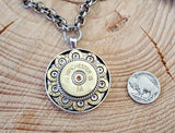 Our "Ricochet Round" necklace is a play on the term used when a round from a gun is fired and it ricochet's off of a surface, sending it flying in yet another direction. This necklace is comprised of several "rounds" of 32 auto casings set in the outer frame of the "round" pewter frame pendant. A brass 12 gauge shotgun casing, set in our signature rope bezel is stacked in the center and gives the medallion just the right amount of detailing.