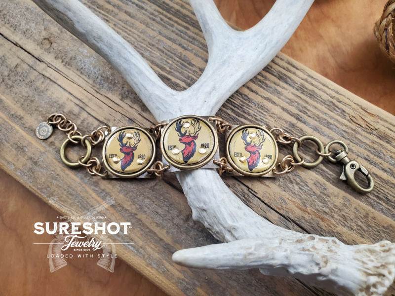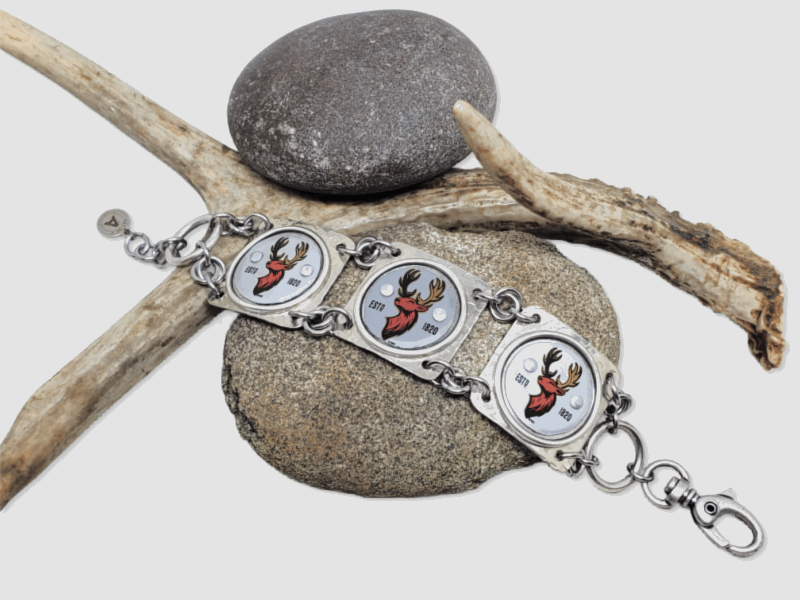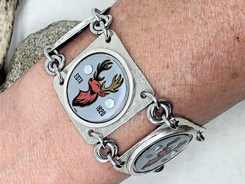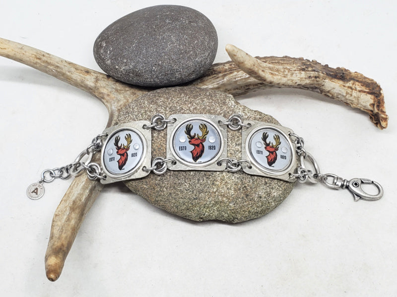 This handcrafted link bracelet features three authentic vintage bottle caps with a bold red buck head on a gray/silver background, transformed into a rugged yet refined statement piece. Designed and built entirely by hand, this bracelet is an exclusive SureShot Jewelry original—you won’t find it anywhere else.