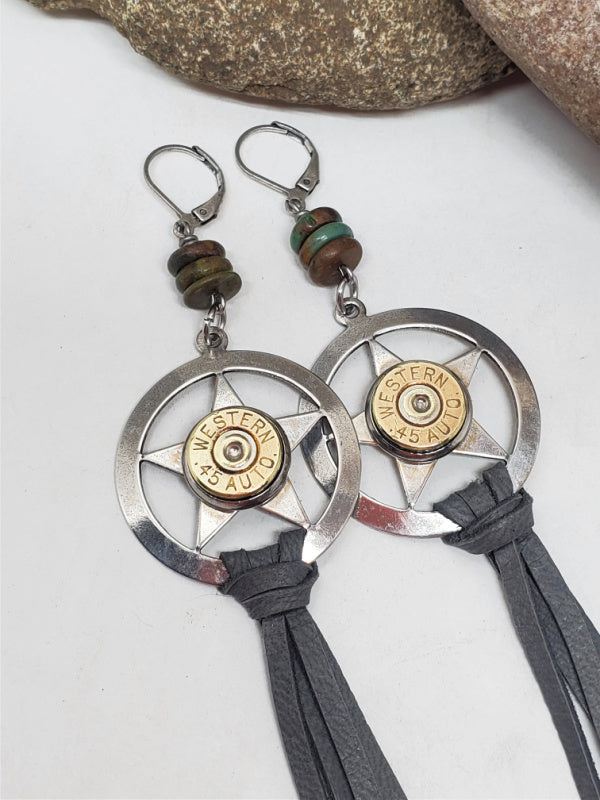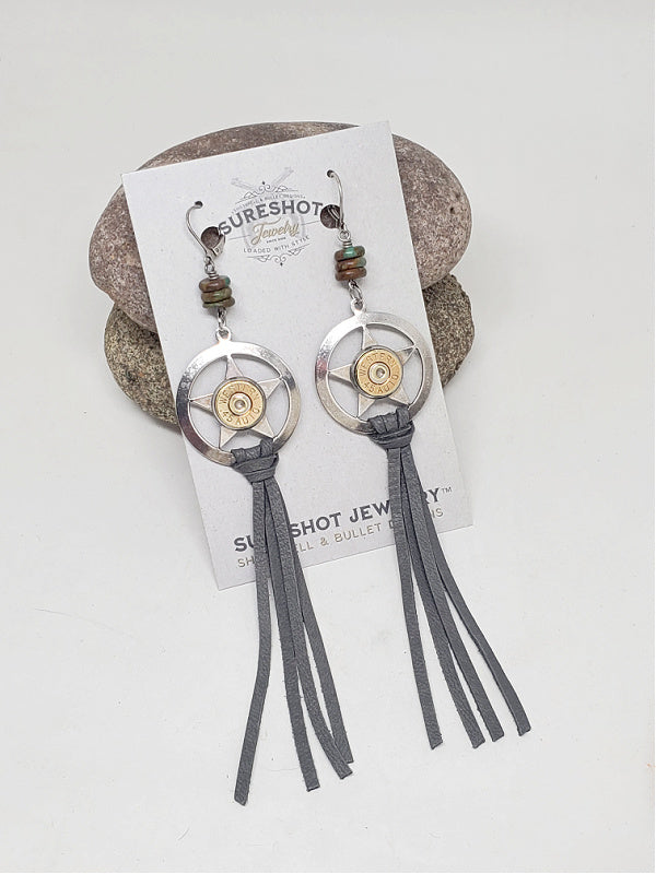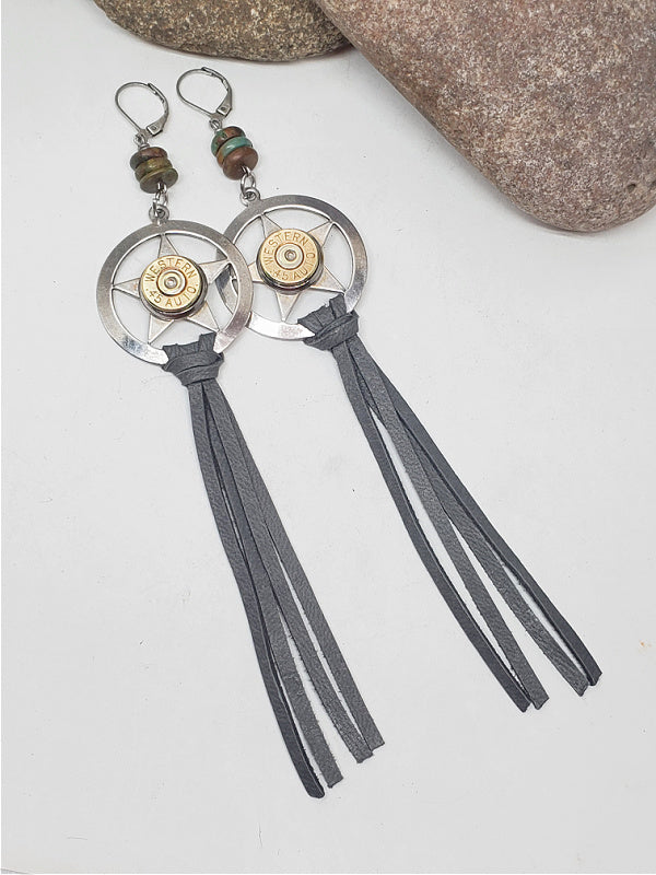Show off your adventurous side with these Lone Star Gray Leather Tassel Bullet Earrings. Perfect for any cowgirl, sharpshooter, or boho lover, these earrings are crafted using silver "lone star" style pendants embellished with brass bullet casings mounted in stainless steel bezel cups for expert quality and finish.