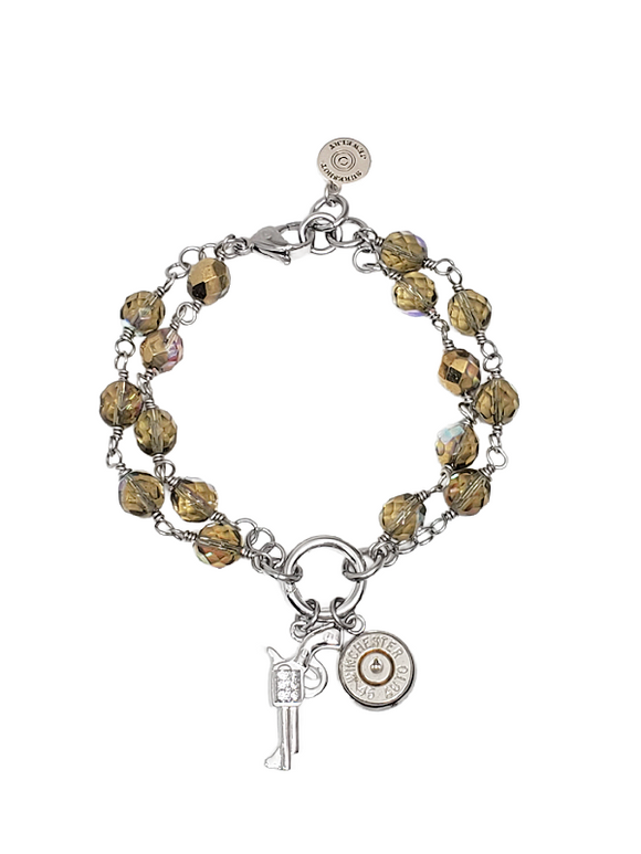 Elevate your style with double strands of sparkling faceted aurora borealis fire polish beads linked by a stainless steel versatile circle clip adorned with a nickel bullet casing and a dazzling CZ embellished pistol charm. Perfect for showcasing your passion for the gun-loving lifestyle, this bracelet features beautiful smokey color glass beads that glisten in the light with a rainbow of hues as only aurora borealis can do. The multitude of shades make this a versatile accessory for your jewelry collection.