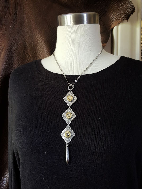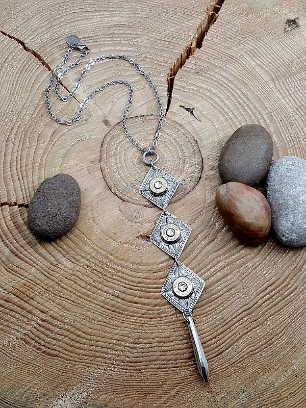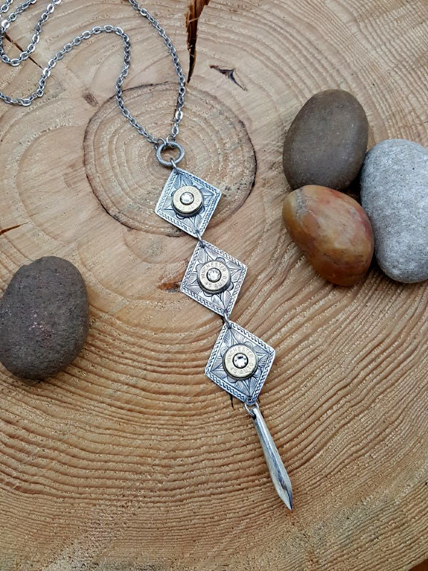 Three hand etched detailed diamond pendants are embellished with brass bullet casings framed in smooth edge bezel settings.