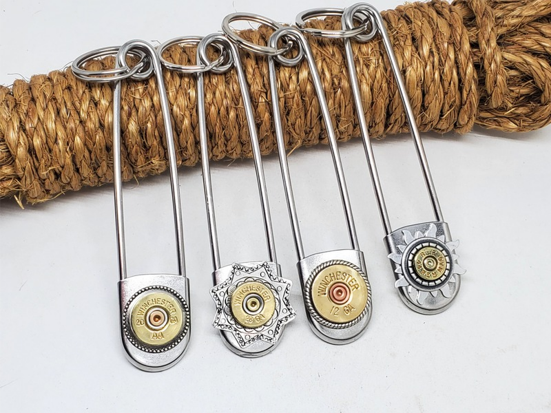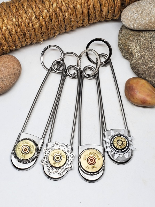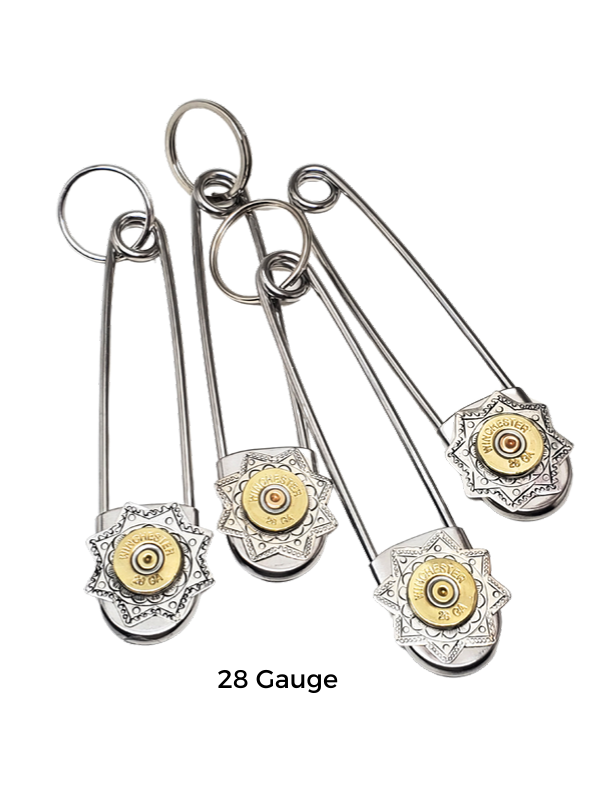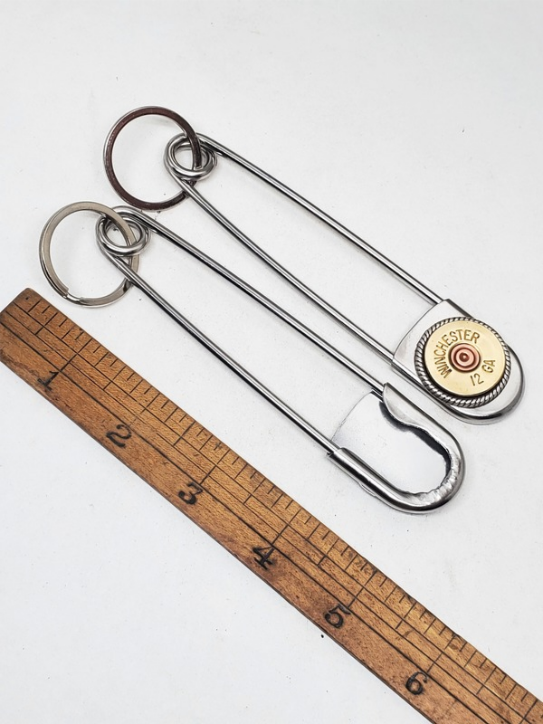 Our new, original shotshell and bullet casing jumbo safety pins are a bold and versatile must have accessory! Whether you use this as a key chain, a purse charm, adorning the belt loop of your favorite jeans, or pinned to a hunting bag or jacket, these will stand out for certain! Some may remember these from the past, so these might be a little nostalgic for some!