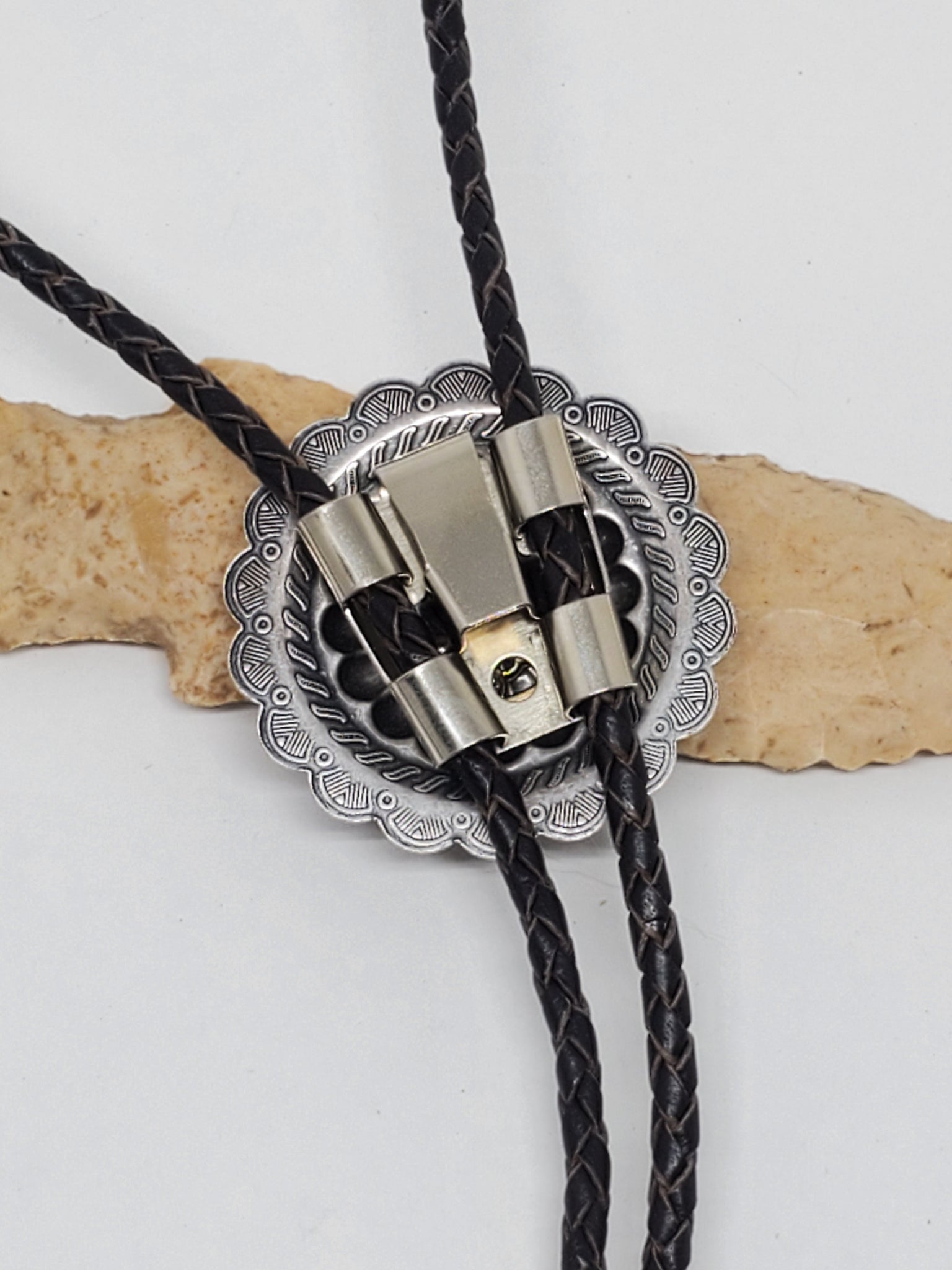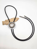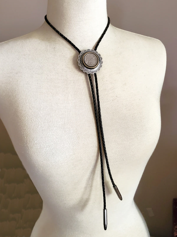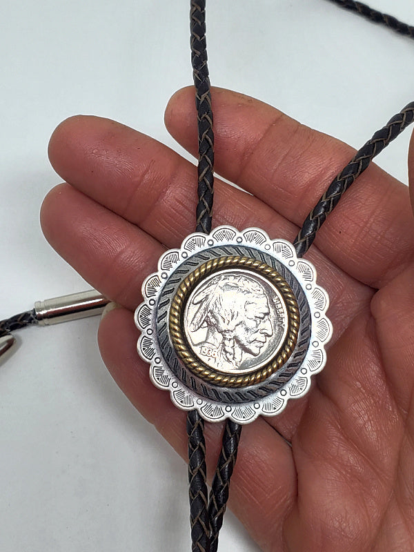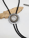 We've expanded both our buffalo nickel offerings and our collection of bolo ties with the addition of this new, concho bolo tie featuring a genuine buffalo nickel coin set in our antique brass rope edge bezel and mounted to a highly detailed round concho in antique silver.