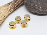 These unique tuxedo studs are produced using SILVER tone stud components with your choice of genuine brass or nickel bullet casings. Calibers will vary, but are restricted to the bezel size of the studs. This means calibers such as 9mm, 38 special, 357 magnums, and 40 S&W will be used. Photos show brass 9mm.