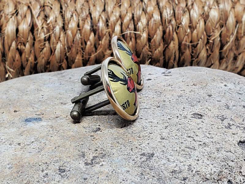 We have both silver and gold background bottle caps (see photos). This listing is for the golden background caps that we've cut from the caps, hand-dapped (see side view of cuff links showing how they are domed), and mounted in raw brass walled bezel cups. How cool is that?! Both are in turn mounted to antique brass cuff link bases.