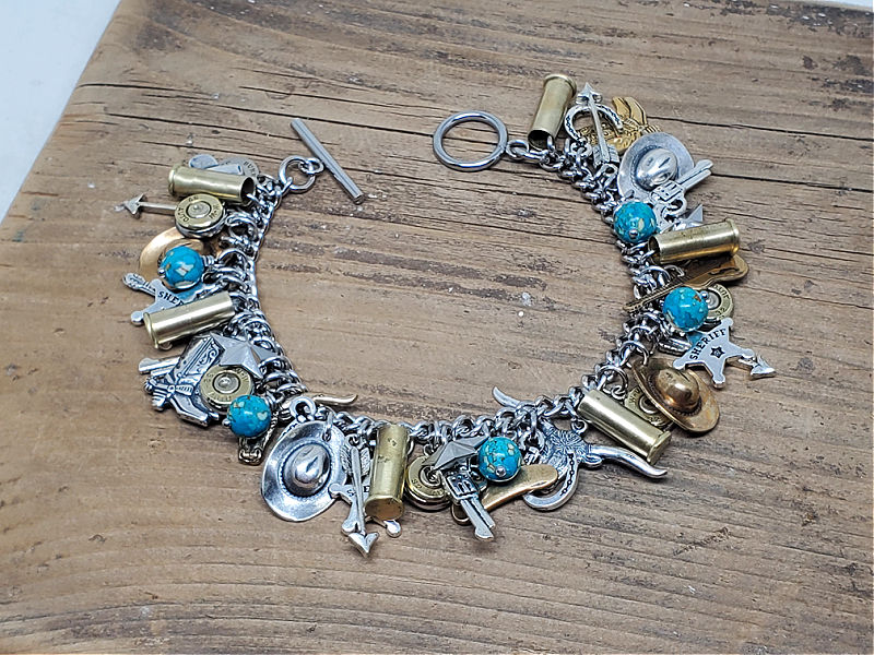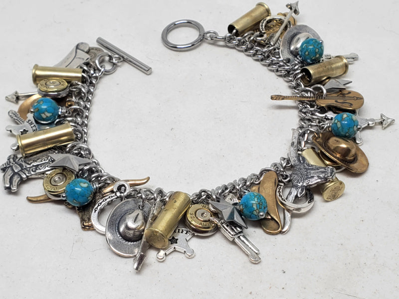 There are pistol charms, real ammo (32 auto casings and 22 calibers), cowboy hats, steers, arrows, guitars, sheriff badges, horseshoes and more. And to add some color to the theme, we added some pretty turquoise beads. The arrangement of each one may vary slightly, but the overall bracelet will be consistent in styling, composition, balance and proportion. For example, we have sheriff badges in both antique gold and antique silver as well as a few of the other charms, so I will mix these appropriately for balance and design. The result is a loaded mix of themed charms that look so cool!!