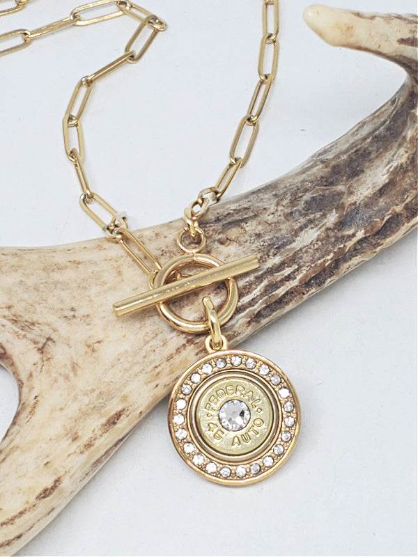 Beautiful CZ diamond encrusted solid back gold stainless steel pendant embellished with a brass bullet casing and topped with a diamond crystal to complete the look and add more sparkle. The pendant has a nice weight to it, enhancing the quality of the bullet necklace.
