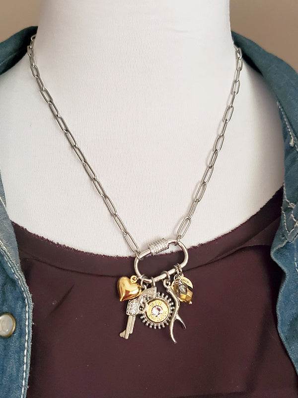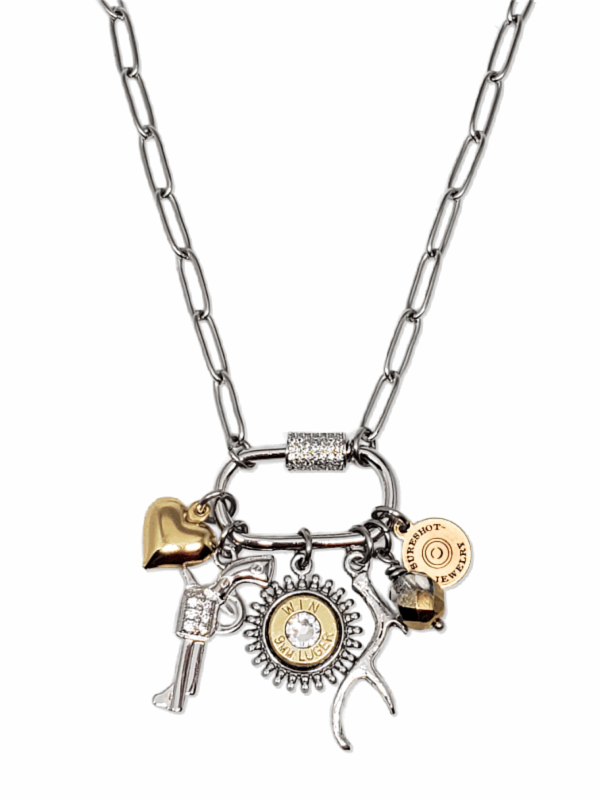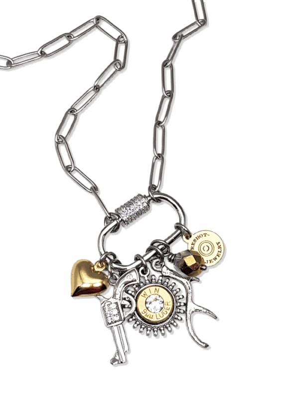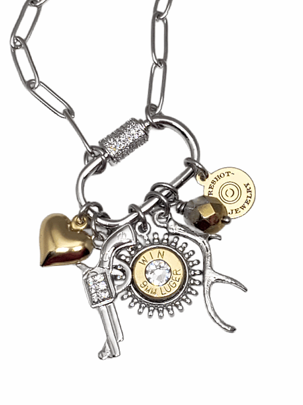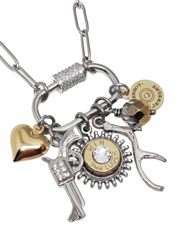 For the outdoor-loving woman, our multi-charm necklace is the perfect accessory. Featuring a heart, antler and a dazzling CZ pistol charm, along with a brass bullet casing mounted in a beautifully detailed sunburst-style pendant, this piece is both stylish and unique. A rainbow fire polished bead and our signature logo tag complete the look.  All all of the charms are thoughtfully assembled on a stainless steel CZ embellished screw lock or carabiner-style clasp.