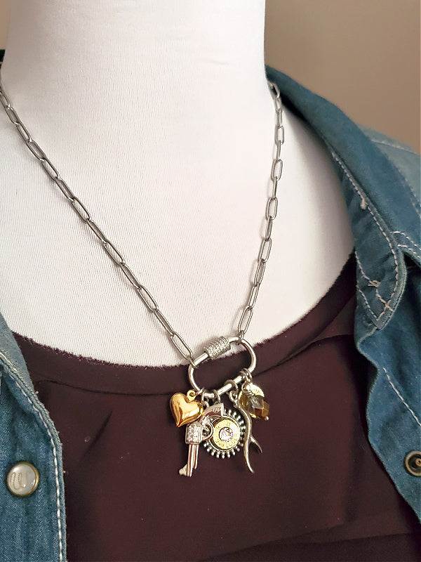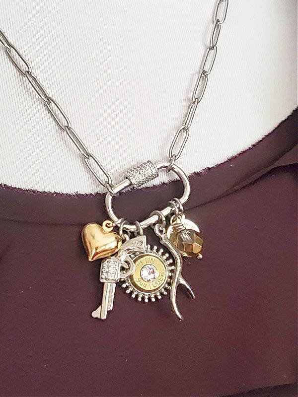 Gun Girl Mixed Metal Multi-Charm Brass Bullet Necklace