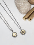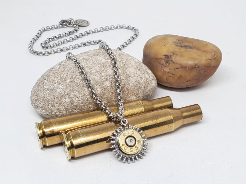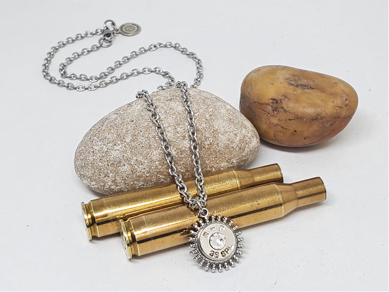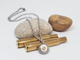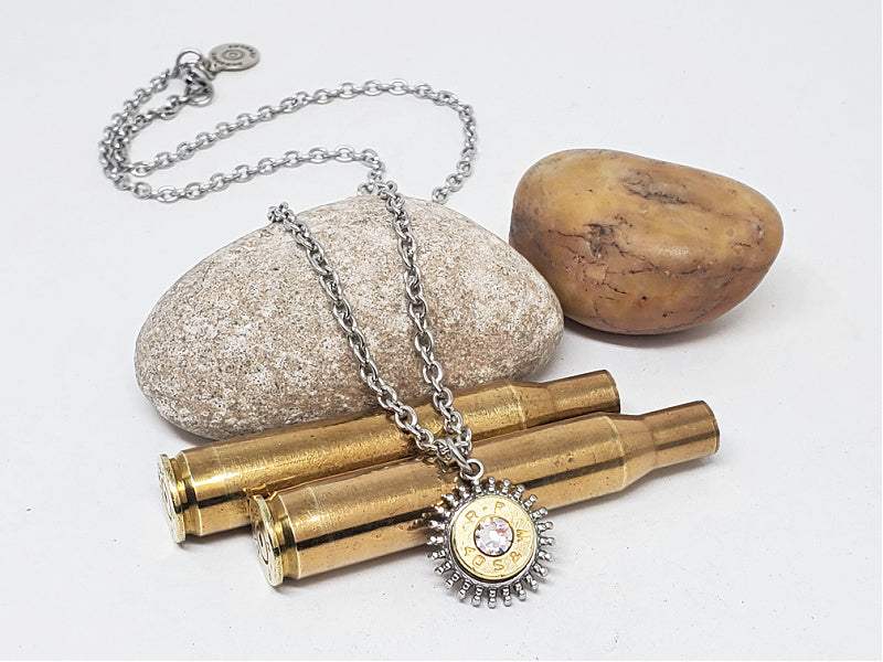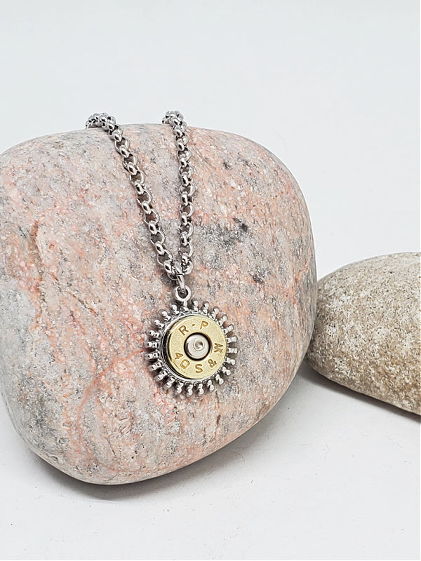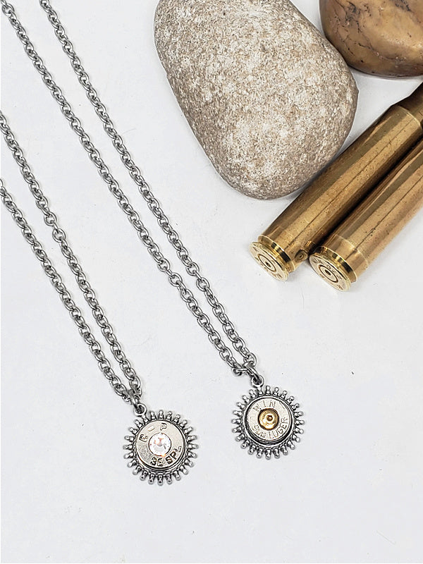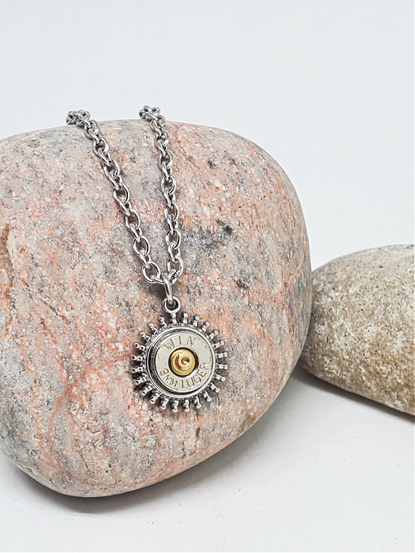 Pretty stainless steel sunburst style pendant with the perfect size setting base for a small caliber bullet casing to be nestled in the center.