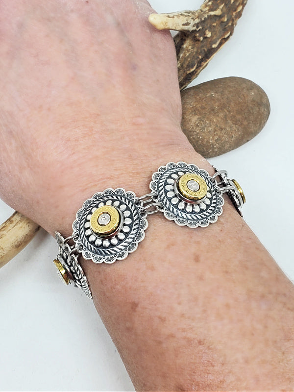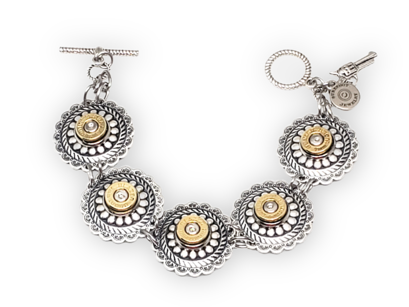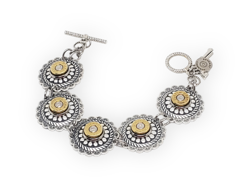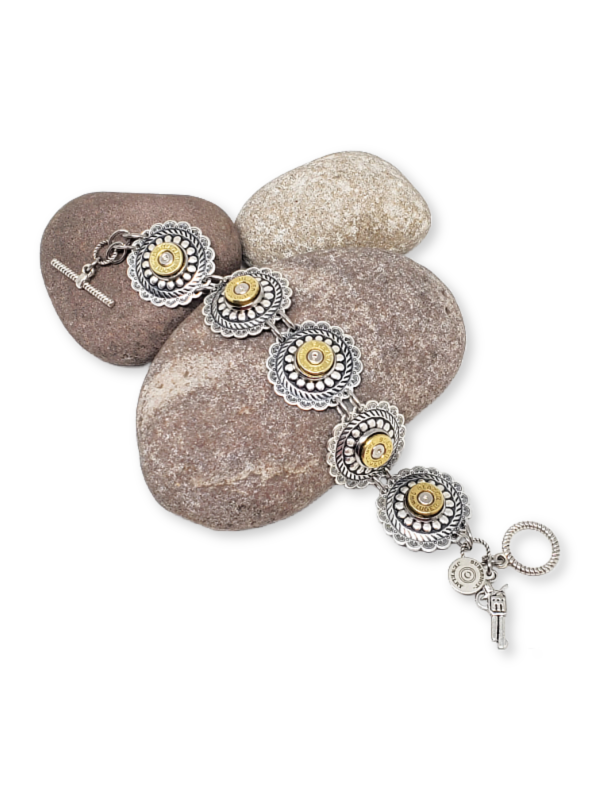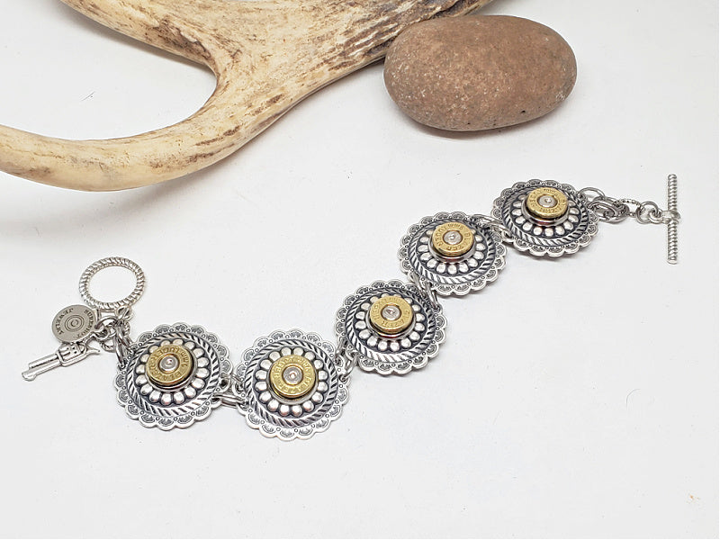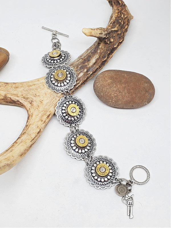 Each concho is mounted with a brass 9mm bullet casing set in a bezel.  A sturdy toggle clasp with a rope textured look completes the look.  Brand of casings vary but will be consistent throughout each bracelet produced.