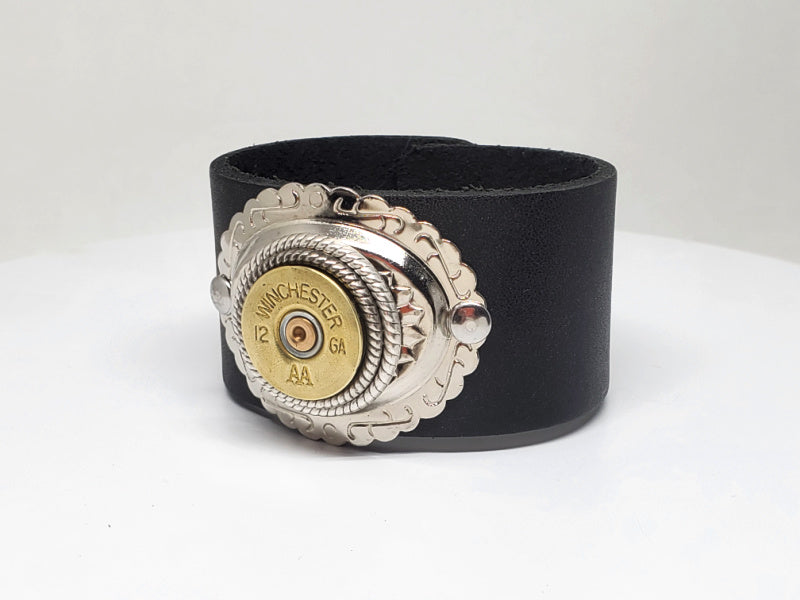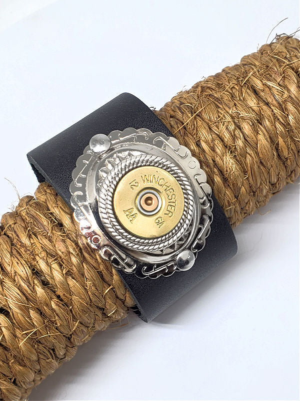 Thick, 7 oz black leather cuff bracelet is embellished with all hand riveted components - a detailed oval silver concho, our double mounted rope edge bezels and a 12 gauge Winchester brand shotgun casing.