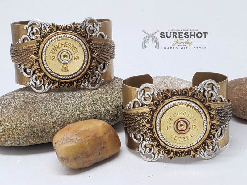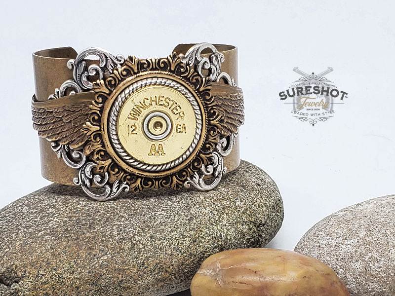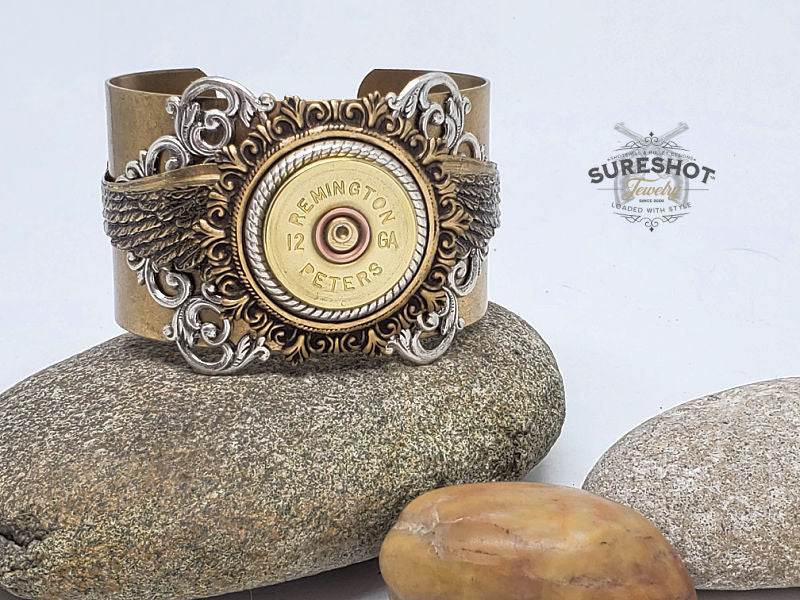 Mixed metals utilizing detailed filigrees and wings, creating an awesome setting for the 12 gauge shotgun shell casing.  Rounded ends make for easy on and off.