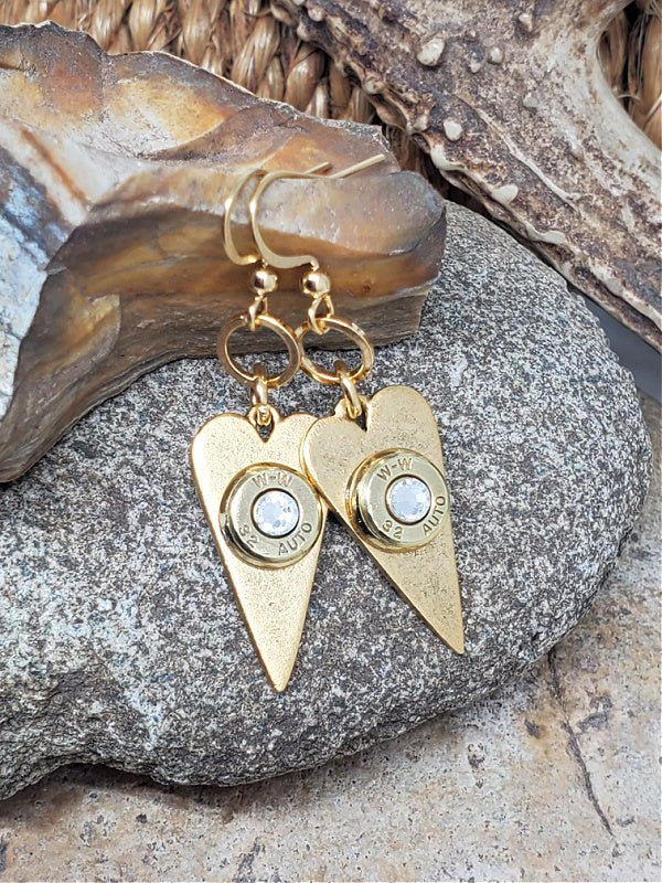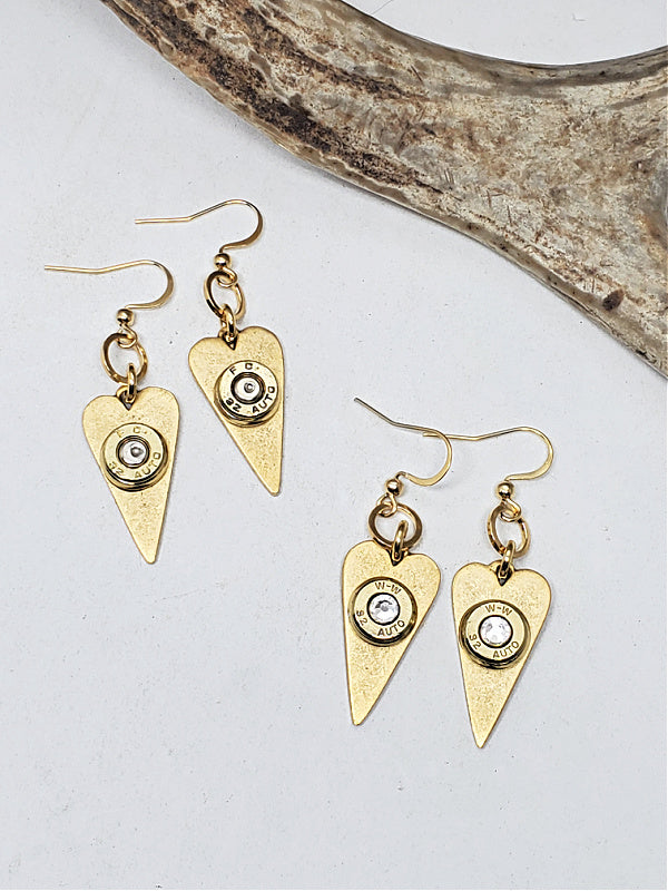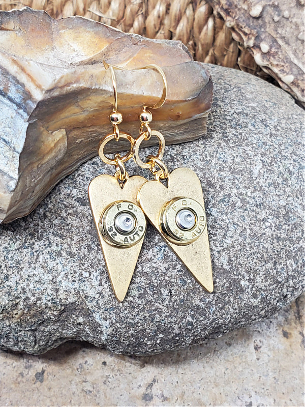 These elongated heart bullet earrings are a new redesign of a sold-out SureShot Jewelry favorite. Each pair features 32 auto brass bullet casings mounted to slim and stylish antique gold heart pendants for a striking blend of strength and romance.