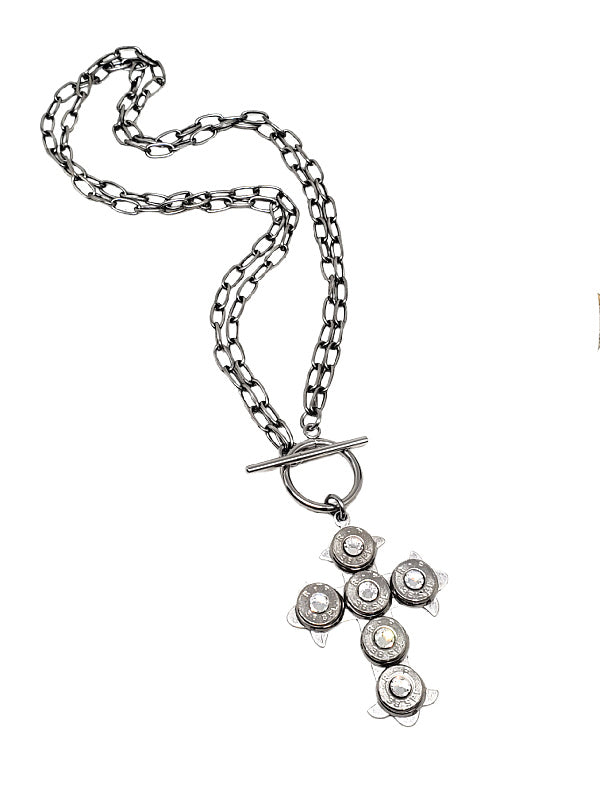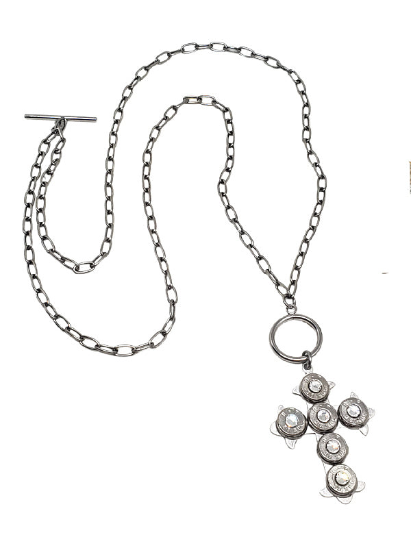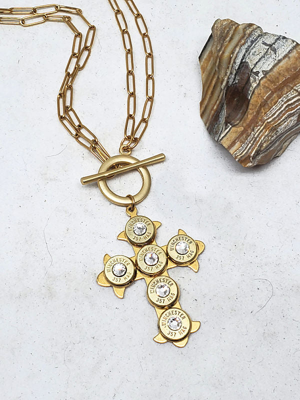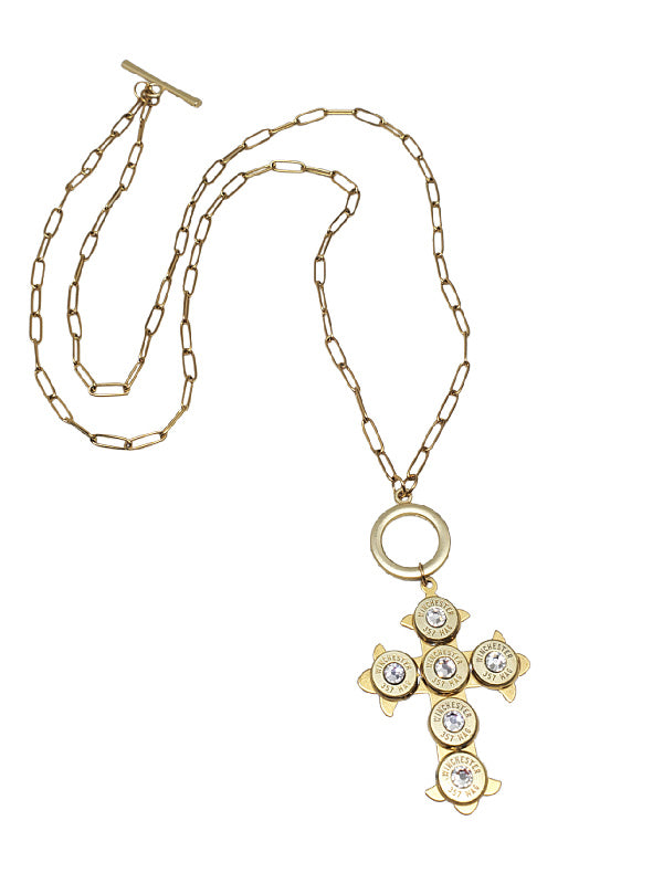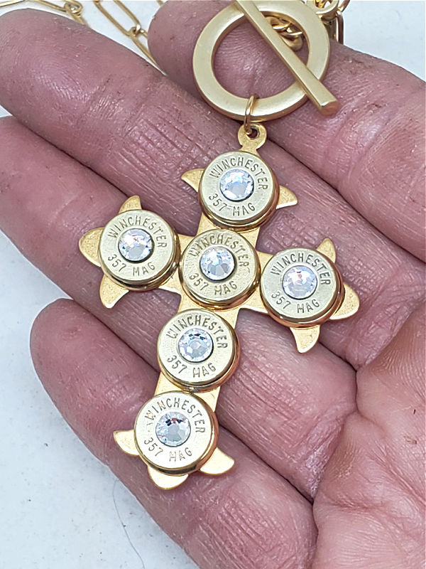 Choice of silver or gold cross, mounted with six (6) 9mm bullet casings, each set in stainless bezels (the gold version uses gold over stainless bezels). We use nickel casings for the silver version and brass casings for the gold version.