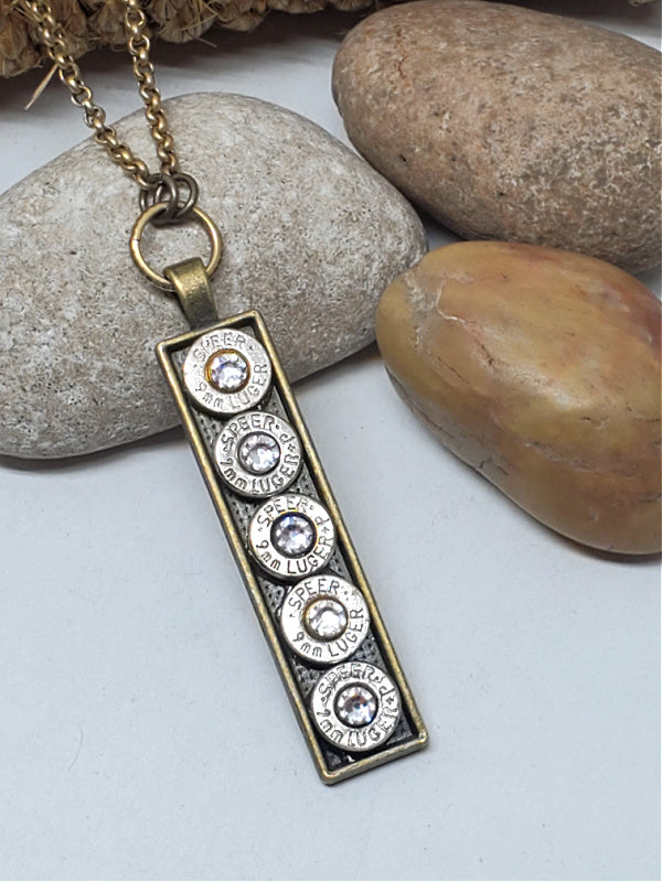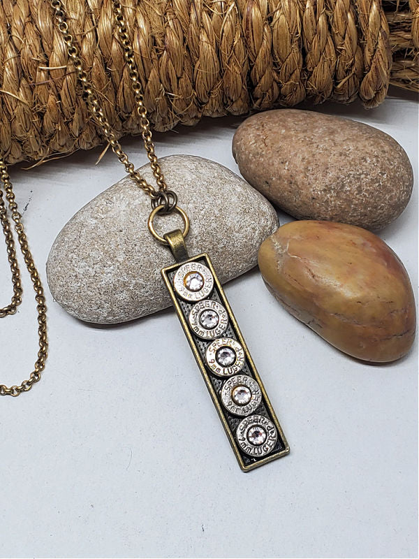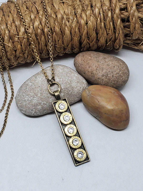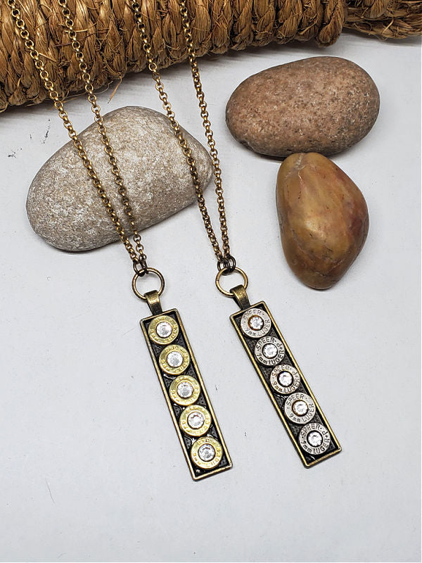 With FIVE TIMES the firepower of a single bullet necklace! Add the long length, slim styling, choice of brass or nickel 9mm casings, and the added diamond bling and this necklace is a MUST HAVE for any lady.
