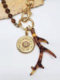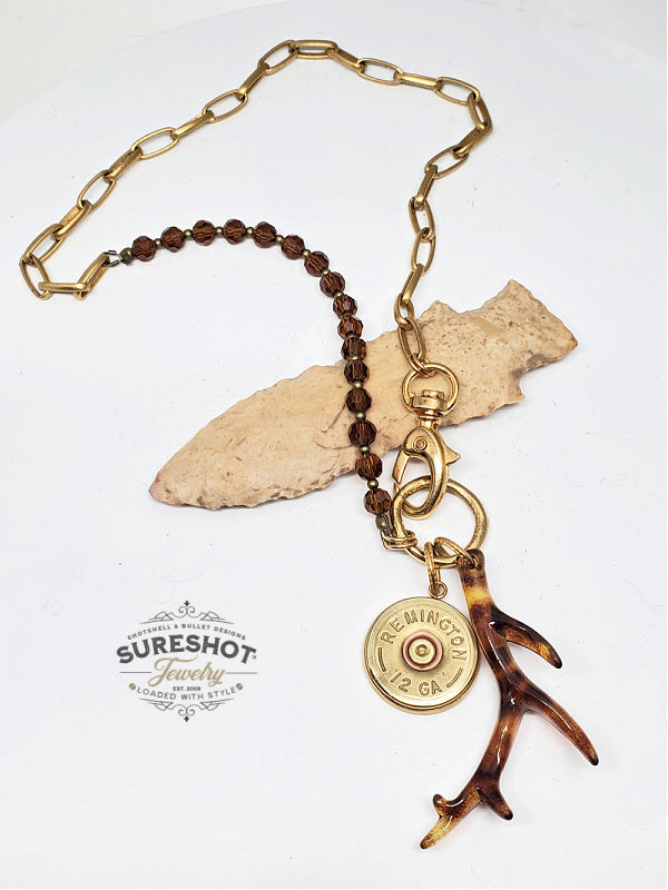 Elevate your bullet jewelry collection with this stunning necklace featuring a hand-wired chain of faceted topaz beads and popular matte gold paperclip link style chain.  A tortoise-patterned antler pendant enhances the topaz beadwork while the addition of a 12 gauge shotshell in a gold over stainless bezel adds a touch of hunting industry flair. Don't miss out on this limited edition piece from SureShot Jewelry.