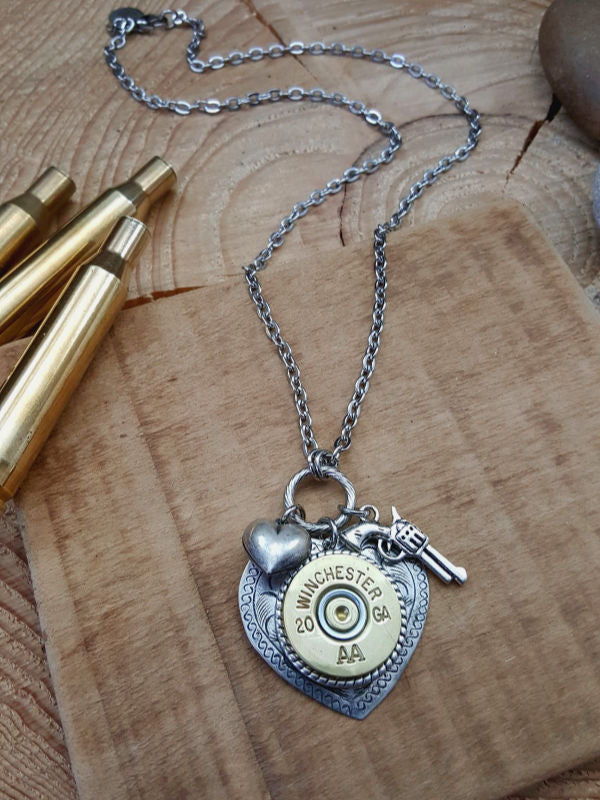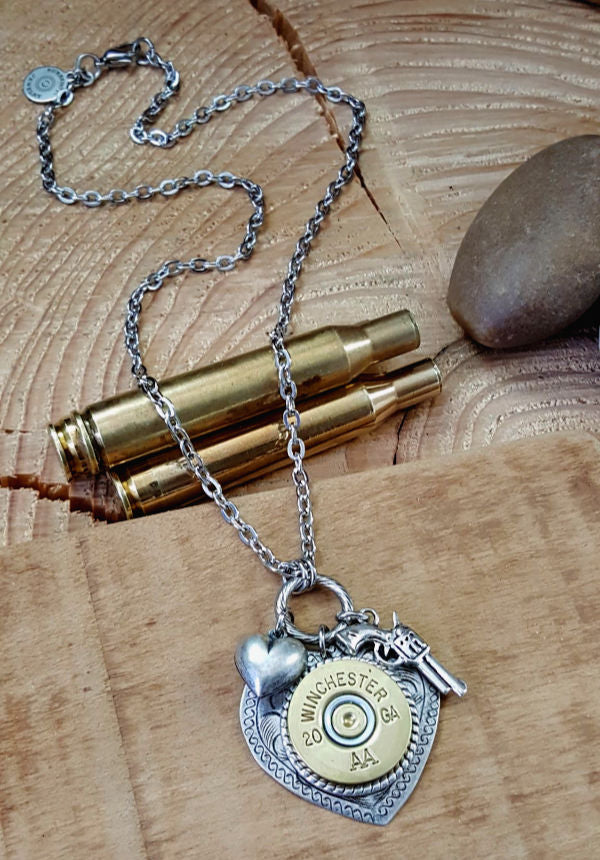 20 Gauge ShotShell Heart Necklace - Shot Thru the Heart Bullet Necklace