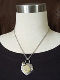 Necklace features a hand-etched antique silver heart-shaped pendant with a detailed design across the front and a smooth back. Brass 20 gauge casing is set in a smooth bezel and mounted to the pendant.