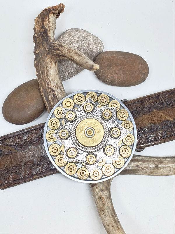 This buckle has a clean, smooth edge on the perimeter and features a bed of brass 9mm bullet casings embellished with a combination of a detailed filigree, topped with 32 auto casings, each mounted in a stainless bezel and finished with a 12 gauge shotgun casing set in our signature rope bezel.