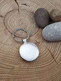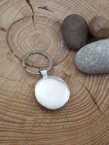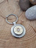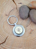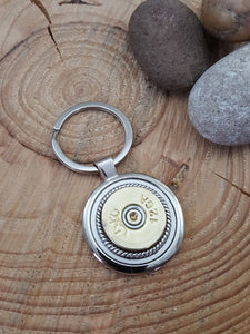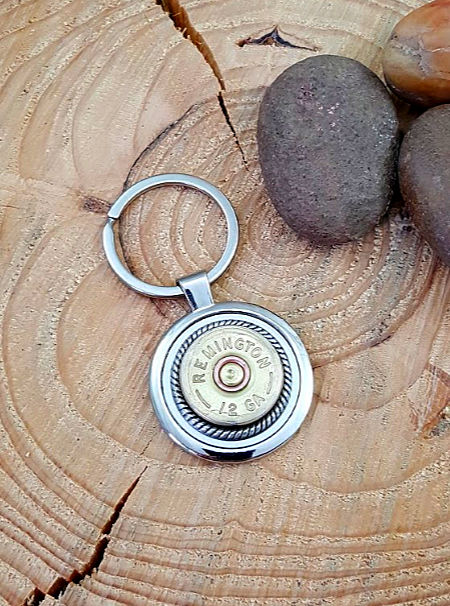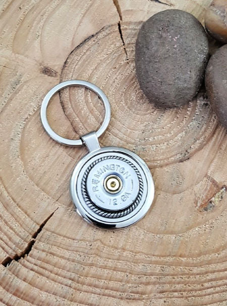 Quality round stainless key chain with 12 gauge shotgun casing mounted in our signature rope bezel.