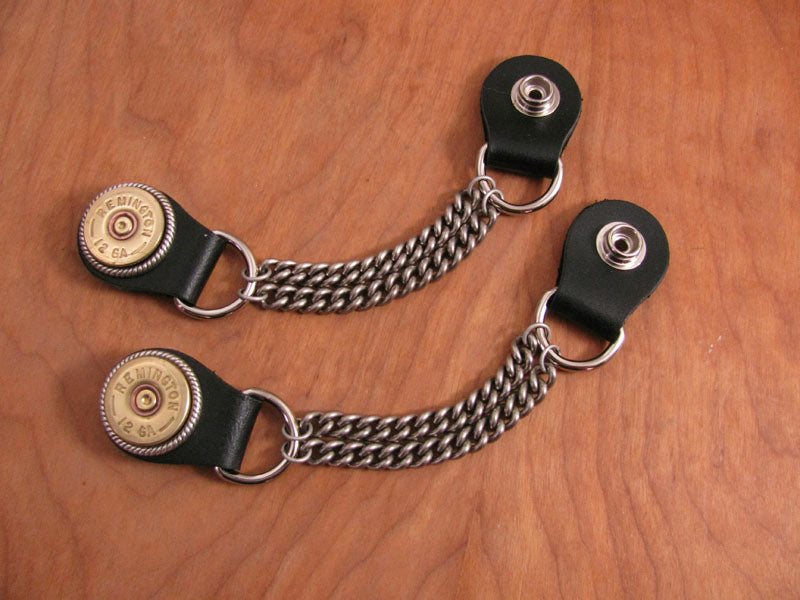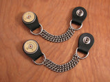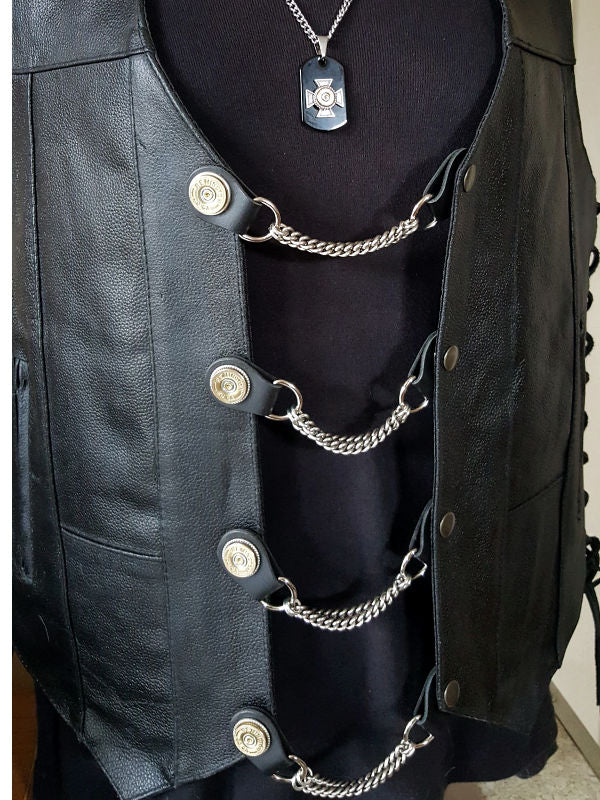 Unlike the machine-manufactured, mass produced knock-offs, our vest extenders are created using hand cut 5-6 oz. black motorcycle leather, solid stainless "D" rings, quality antique sterling over brass heavy curb chain, and hand riveted snaps and shotgun casings. These are the "real deal"!