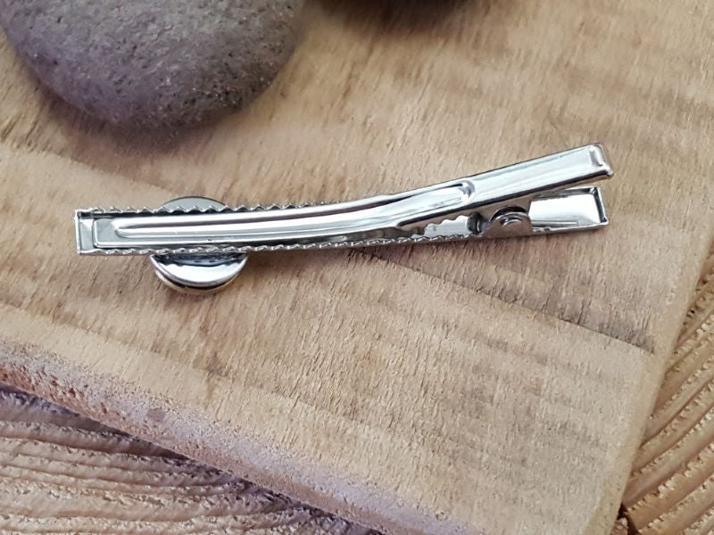 These tie bars are approximately 56mm x 5mm (2 1/4" x 3/16") and are spring loaded, so they will fit snugly to any tie. See photos for back of tie bar.