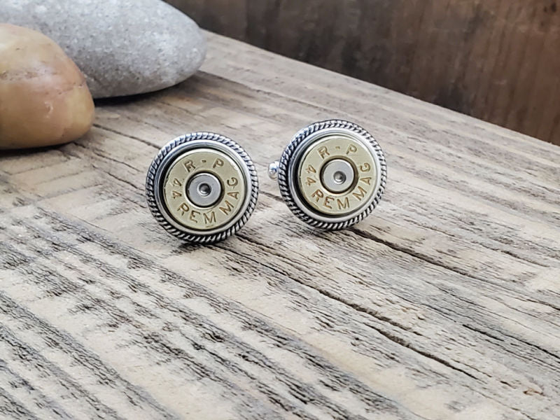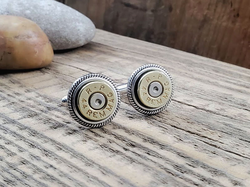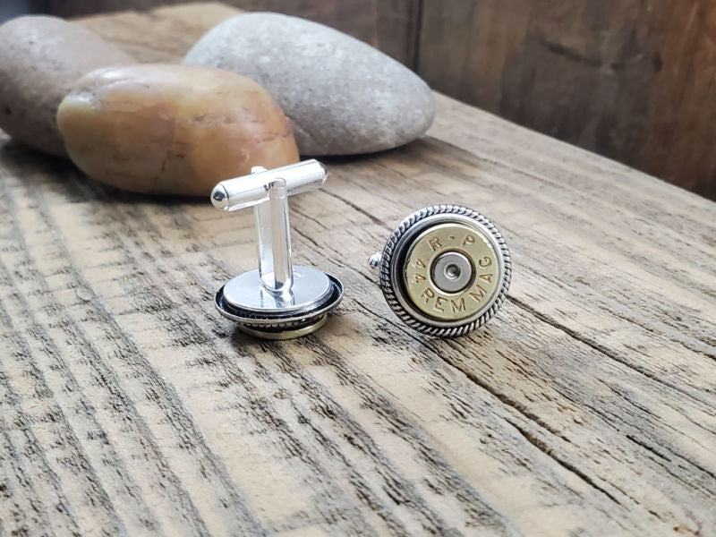 Give a nod to all gun enthusiasts with these trendy cuff links utilizing two 44 magnum bullet casings.
