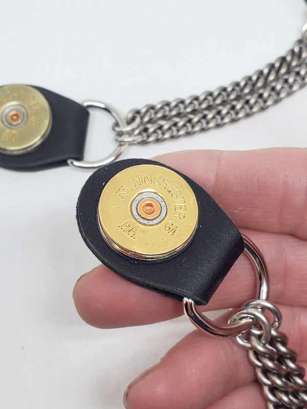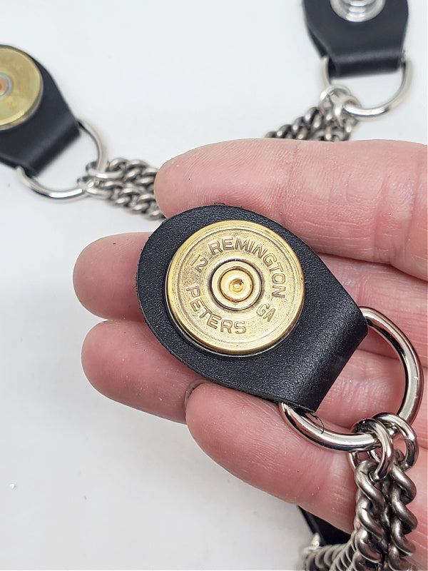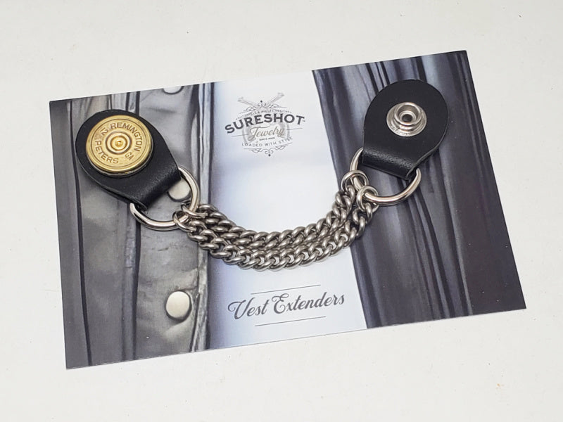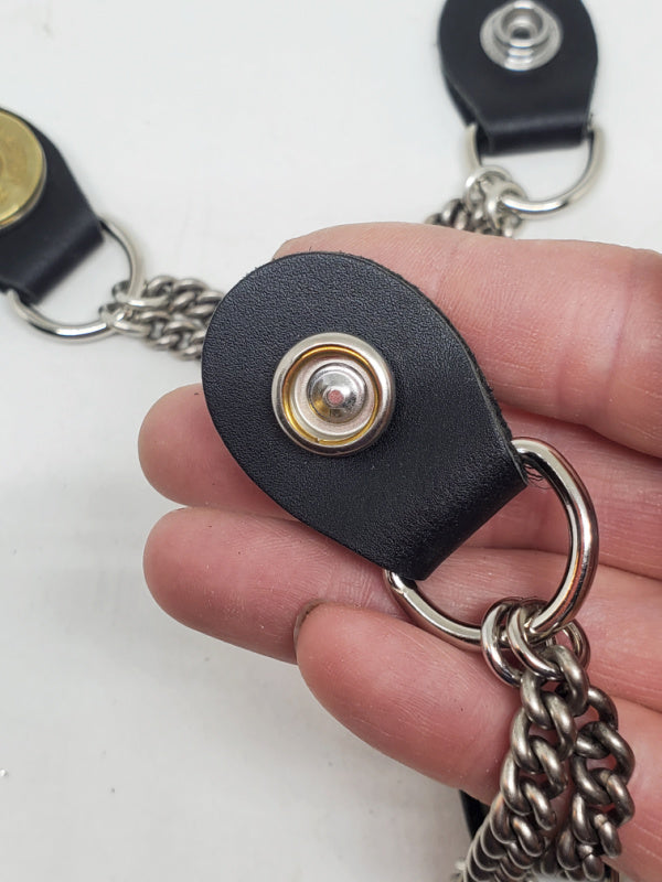 Unlike the machine-manufactured, mass produced knock-offs, our vest extenders are created using hand cut 5-6 oz. black motorcycle leather, solid stainless "D" rings, quality antique sterling over brass heavy curb chain, and hand riveted snaps and shotgun casings. These are the "real deal"!
