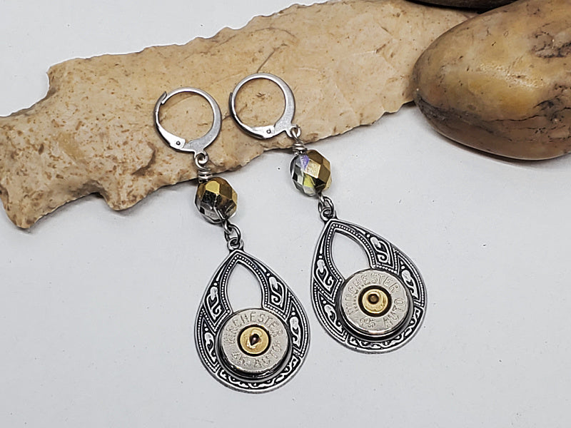 Teardrops are mounted with nickel 45 auto bullet casings with gold primers that contrast to the shimmer of the AB beadwork. They are mounted in antique silver bezels in perfect proportion to the teardrop size.