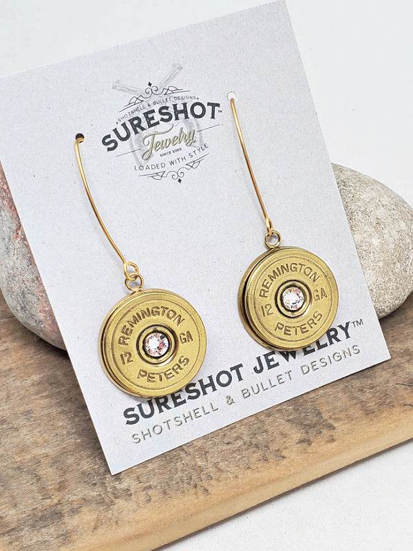 Elegant 12 gauge shotshell earrings made from rare vintage Remington-Peters casings set in gold stainless bezels with long, graceful marquis ear wires.