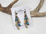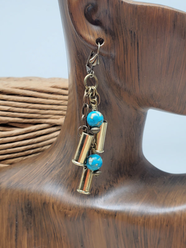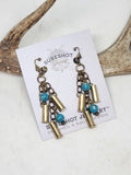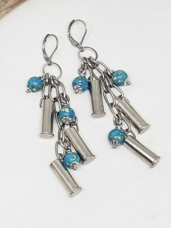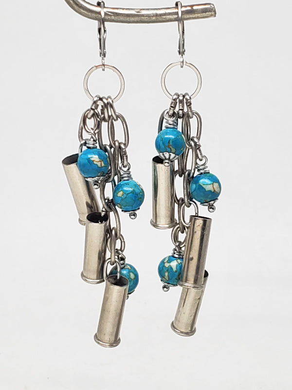 Triple brass 22 caliber silver bullet casings and turquoise beadwork hung at graduated lengths from stainless steel lever backs.