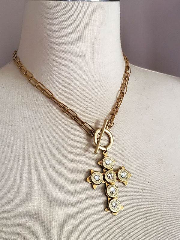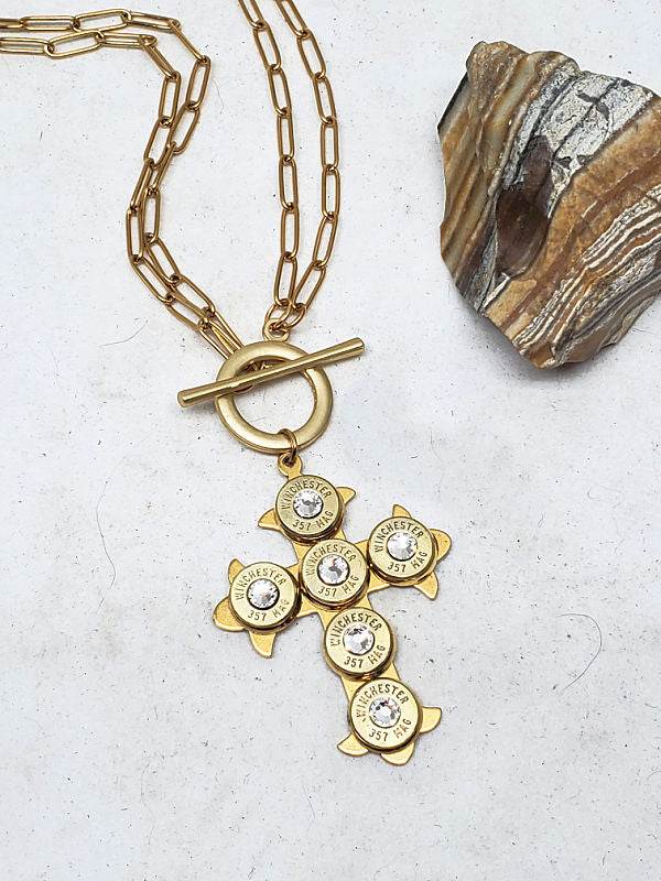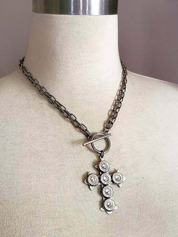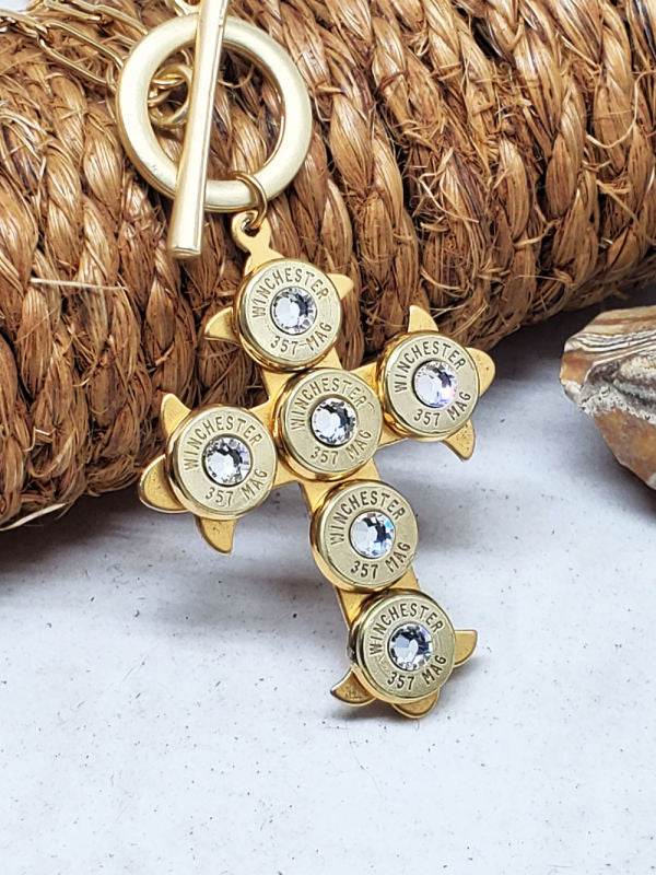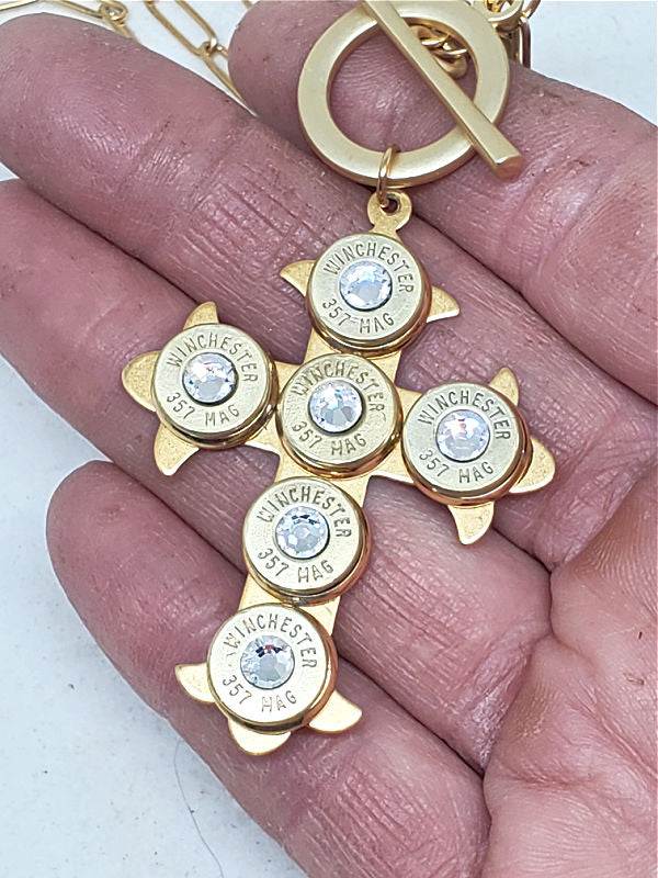 Choice of silver or gold cross, mounted with six (6) 9mm bullet casings, each set in stainless bezels (the gold version uses gold over stainless bezels).  We use nickel casings for the silver version and brass casings for the gold version.