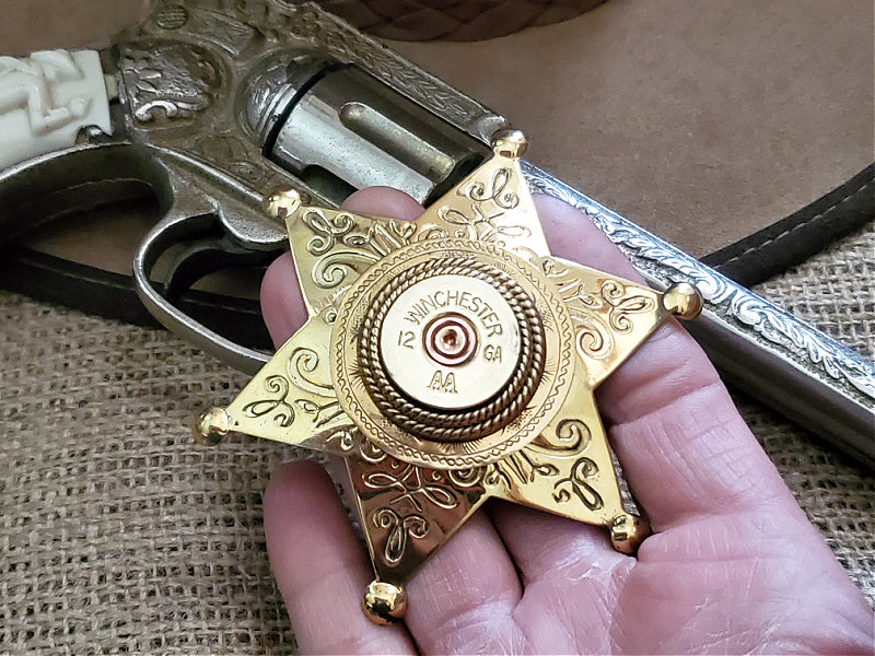 This shiny fancy brass five-point sheriff pin features multiple embossed designs across the star. The focal piece is a brass 12-gauge shotshell, triple-mounted first, in our signature rope bezels, and then mounted on a flat Thai hand etched round bezel, for a standout look.