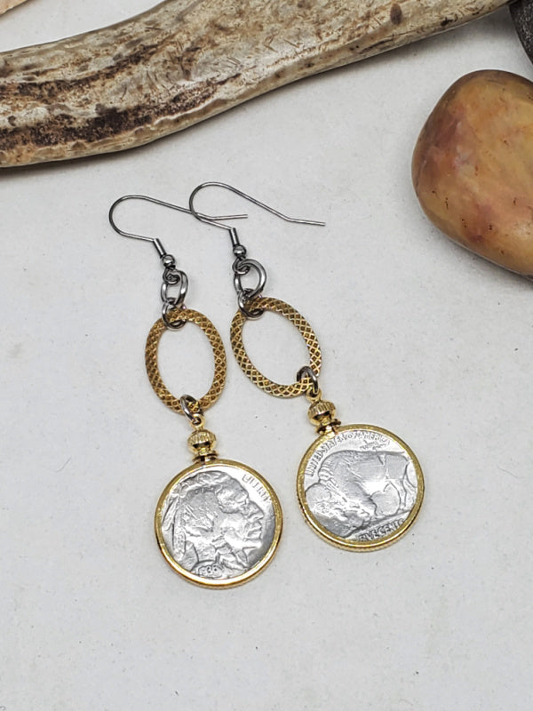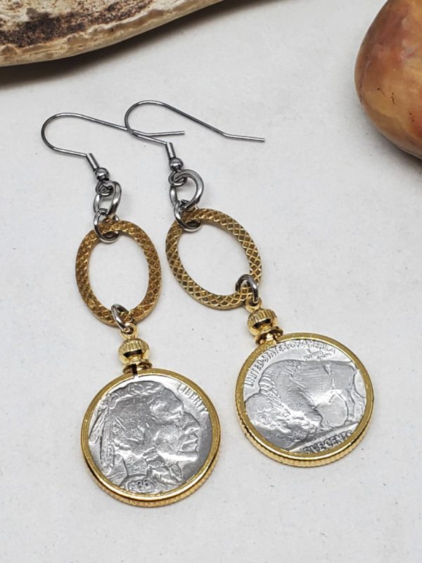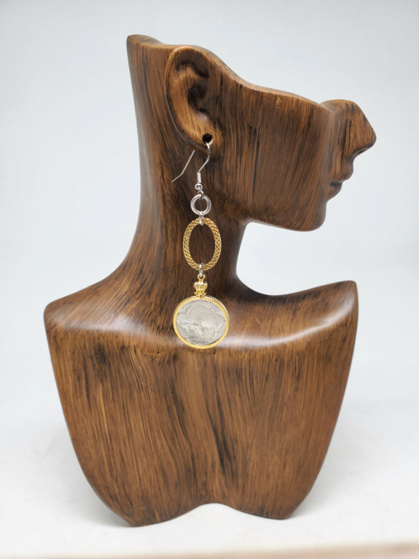 As a new variation to our original BEST SELLING buffalo nickel dangle earrings, we offer this mixed metal pair featuring antique gold connector rings and the nickel set in a gold plated coin bezel. **