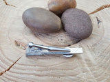 These tie bars are approximately 57mm x 5mm (2 1/4" x 3/16") and are spring loaded, so they will fit snugly to any tie. See photos for back of tie bar.