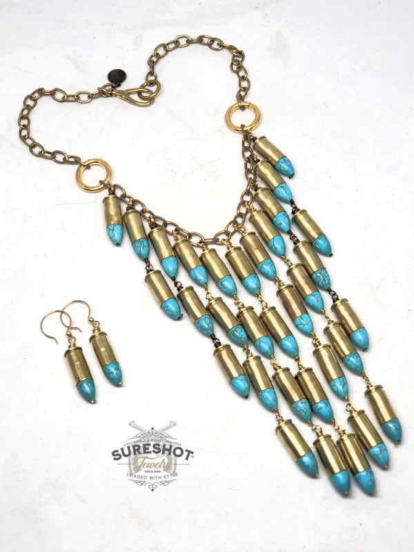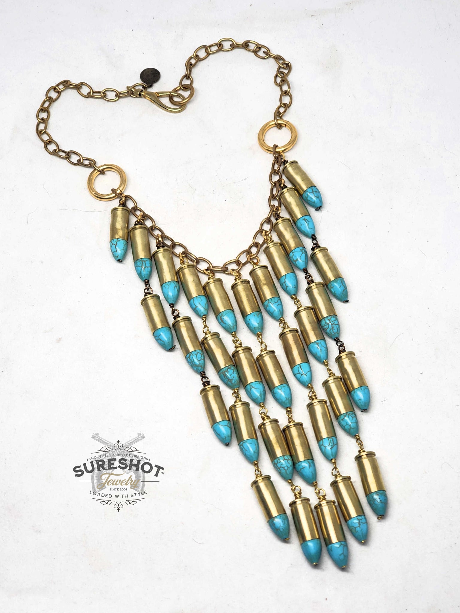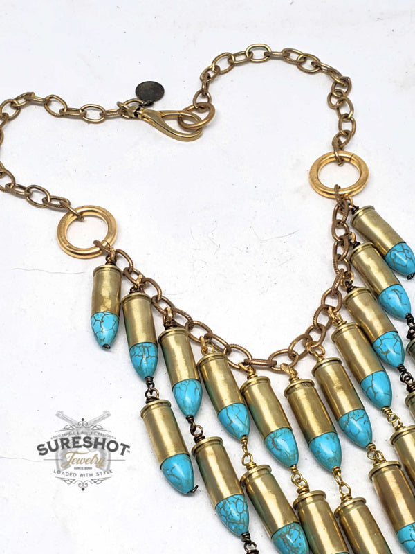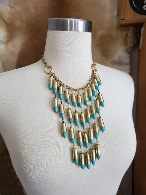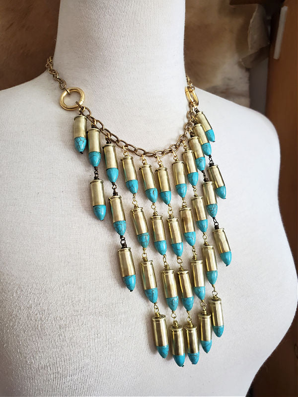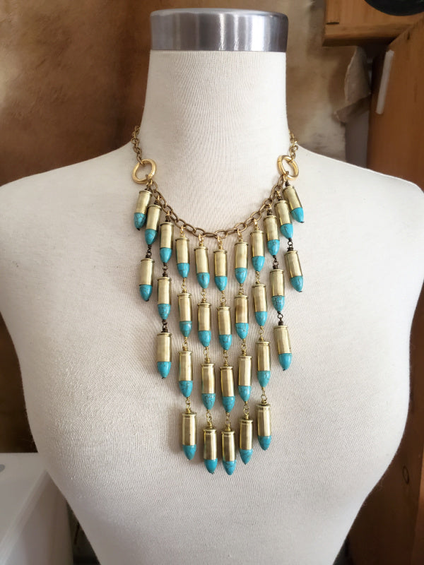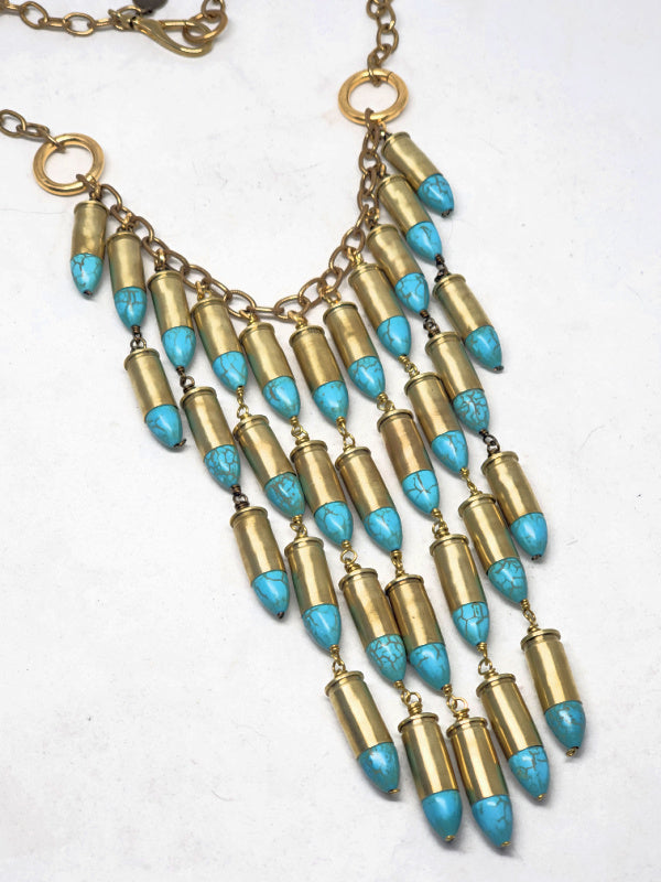Made with 32 auto casings, each hand wired with turquoise teardrop beads. The total number of casings is 32! Purely a coincidence!