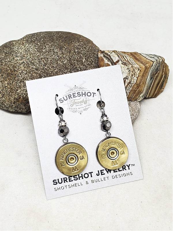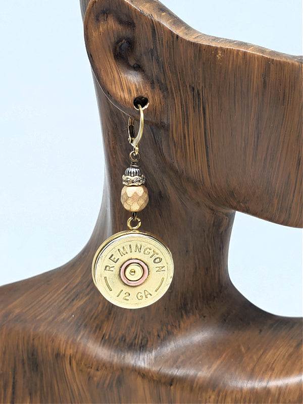 12 gauge shotgun casings set in stainless bezels and suspended from lever backs by coordinating faceted beadwork.