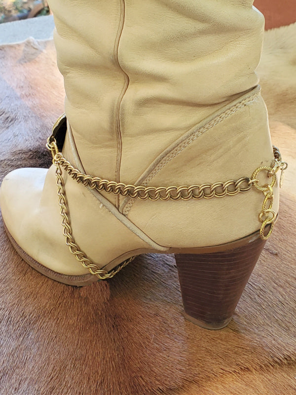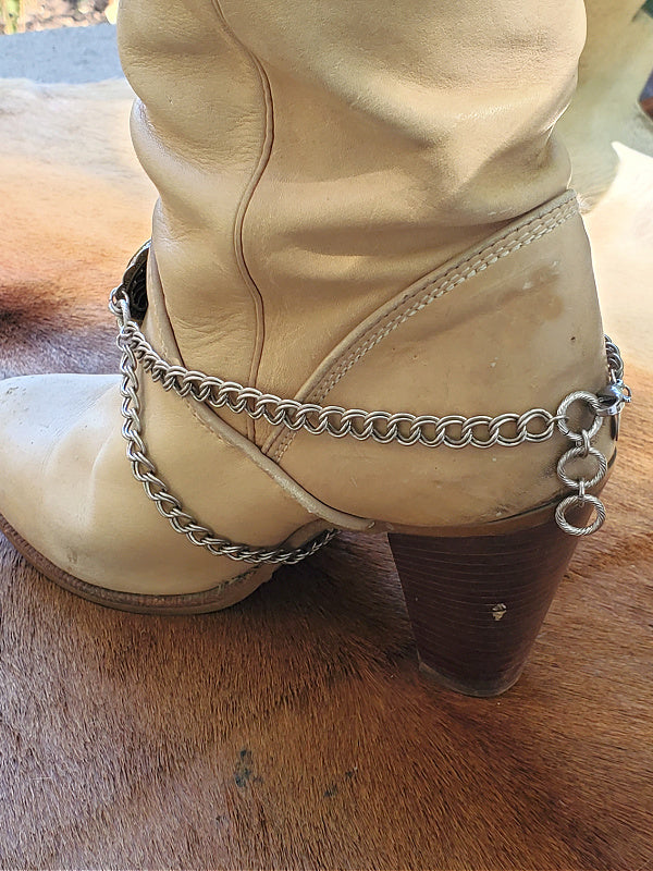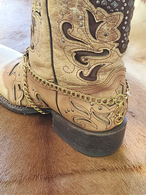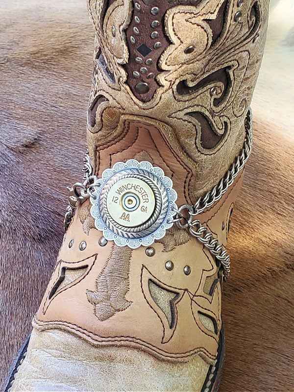 Add bold western style to your favorite cowgirl or heeled dress boots with our NEWEST handcrafted boot bracelet. Designed with a scalloped concho as the focal piece, an upcycled spent 12 gauge shotshell (brand will vary), and your choice of antique silver or antique gold chain and components, this boot accessory instantly elevates any western or classic boot style.