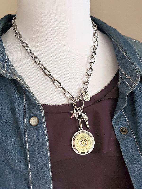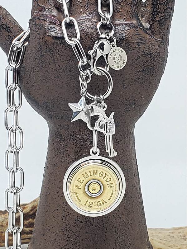 For ladies who want fashion-forward jewelry that showcases their love of hunting, we have designed a versatile 12-gauge shotshell silver paperclip necklace. This necklace features a stunning CZ-encrusted matching pistol charm and a 3D star charm.