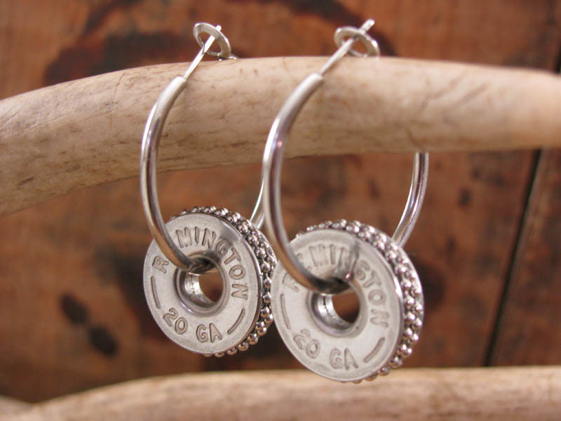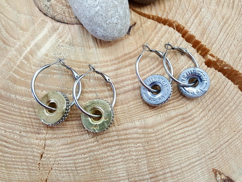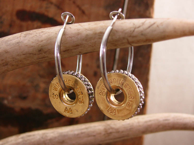 Each pair is handcrafted with stainless steel hoops that are 34mm in diameter. Choice of brass or nickel 20 gauge shotshell casings. Casings are embellished with tiny stainless ball chain to give them style, character and added detail, not to mention it really amps up the designer look!