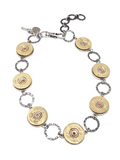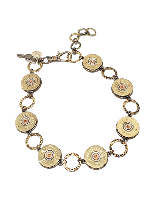 Seven brass 20 gauge shotgun casings, set in sawtooth edged antique silver bezels and joined with coordinating hammered ring connectors.