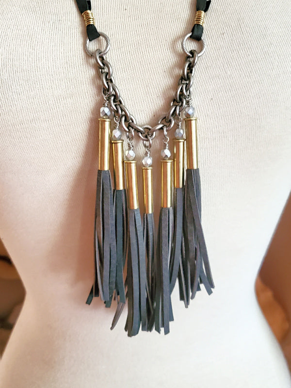 Seven .22 WMR (Magnum) casings are "loaded" with soft genuine deerskin lace in a gunmetal gray with added silvery faceted beadwork to form this modern, mixed metal focal piece. Hung from chunky antique silver links, with dark gray deerskin leather lengths that can be adjusted to suit your personal taste!