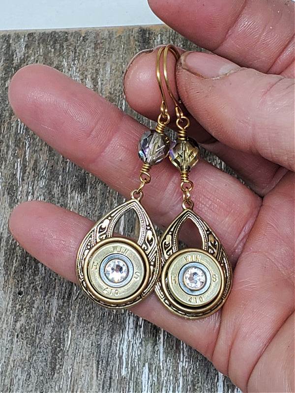 Teardrops are mounted with brass 410 gauge shotgun casings in antique brass bezels in perfect proportion to the teardrop size.  Added bling includes the diamond crystals in the centers of the casings.*