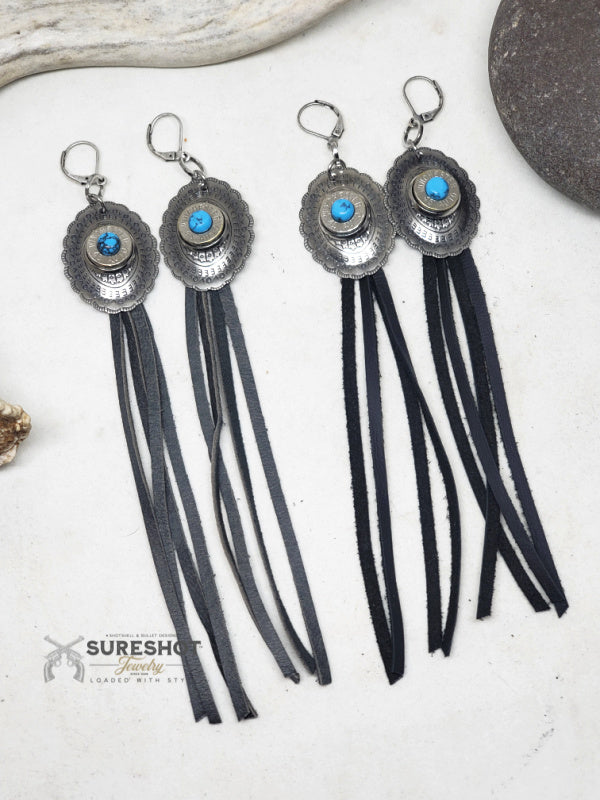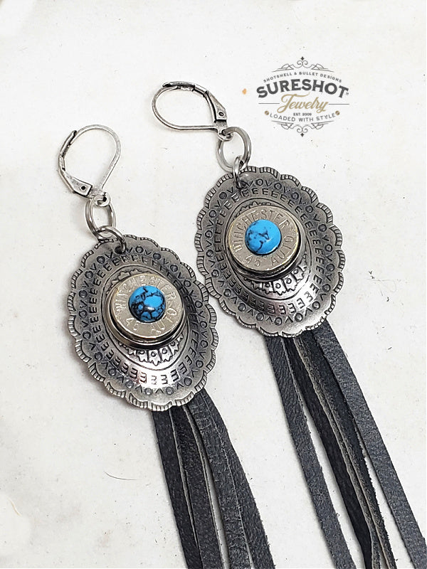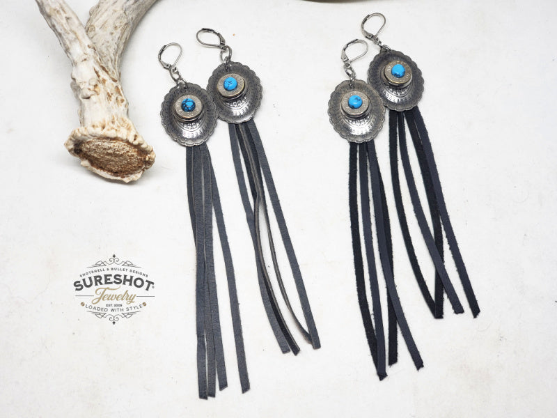 Concho and fringe earrings are great and all, but SureShot Jewelry has ramped up this popular style and made them even better by adding some firepower and topping them with turquoise cabochons in the centers!