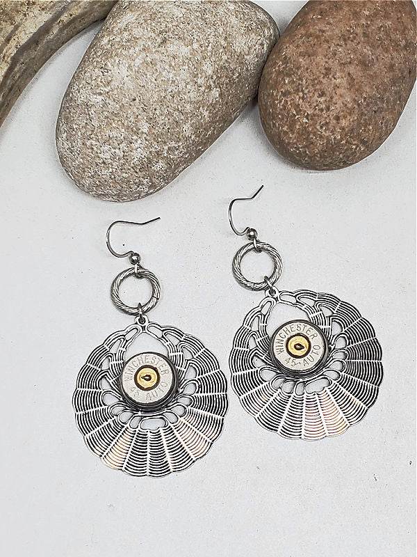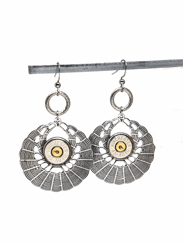 Basketweave look round openwork sterling silver over brass drop pendants embellished with nickel 45 auto bullet casings.  Hung from stainless steel French wires by stainless textured ring connectors.