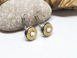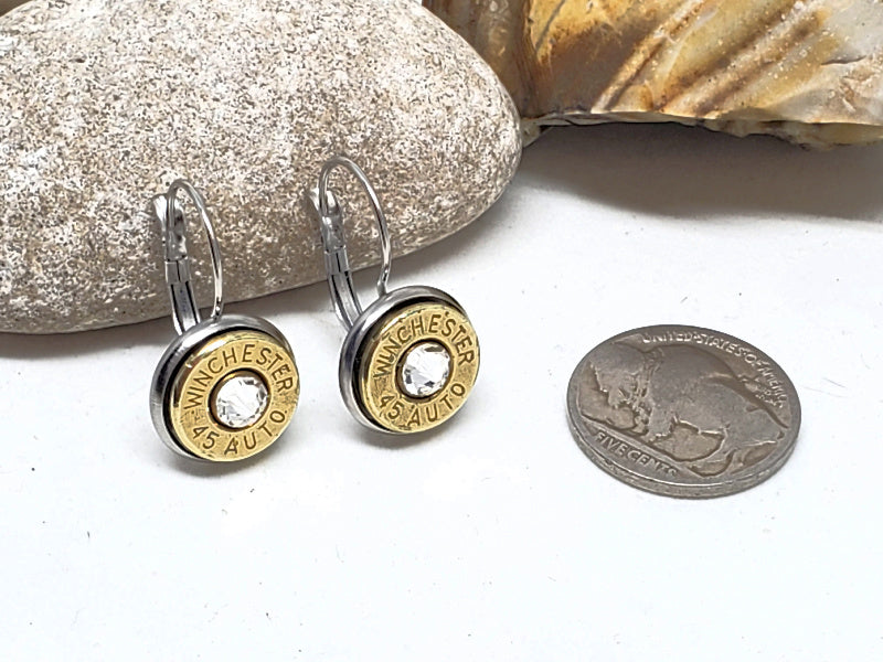 Lever backs are stainless steel with a 12mm bezel. Choice of nickel or brass casings.  Shown are brass 45 auto casings.  Use dropdown to make your selection.