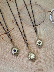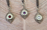 ALL CRYSTAL COLORS AVAILABLE! Optional choice of crystal in center. Use dropdown to make your selection. Shown are a diamond, ruby and amethyst in photos. We have 15 crystal colors to choose from or you can opt for no crystal. Primer centers vary - can be brass or silver.